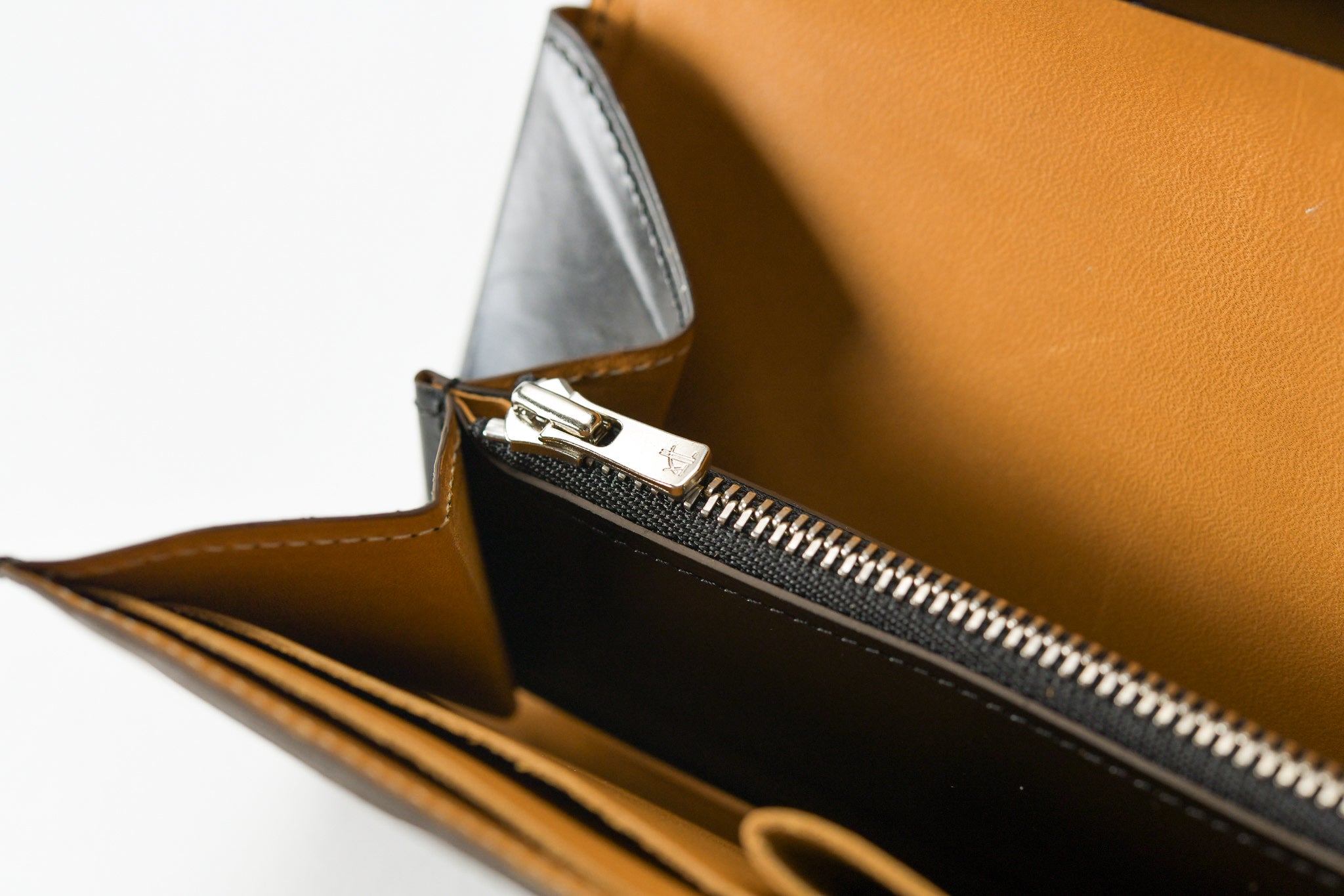 「今回使用したルガトーはトラと呼ばれる模様と深く透明感のある染色が特徴で、その美しい表情から革の宝石とも呼ばれています。エクセラファスナーのエレメントの輝きに引けを取らないツヤ感になっているので高級感がグッドです。」(職人 千秋)