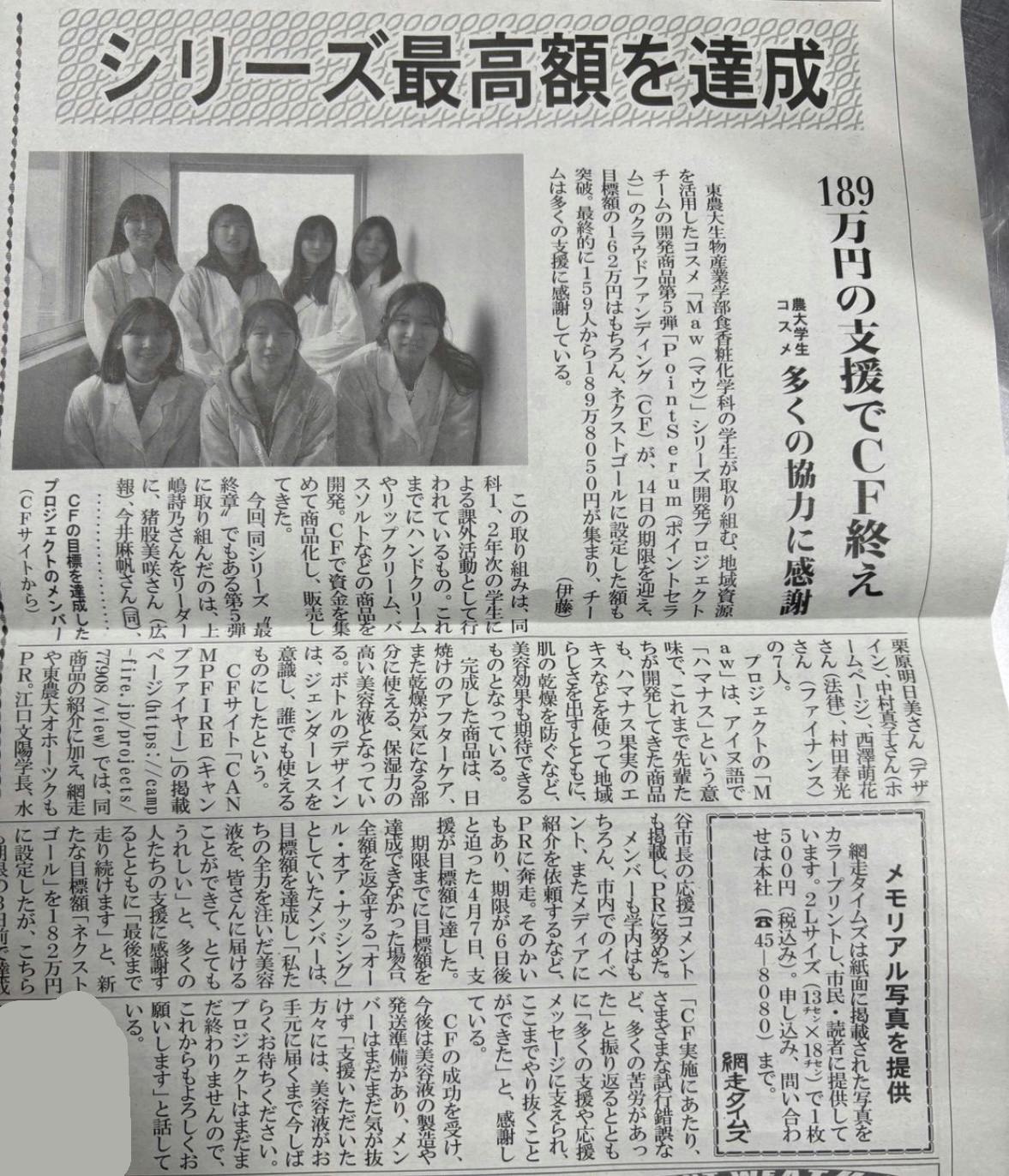 令和7年4月17日付で網走タイムズ社様に掲載されました!クラウドファンディングの結果や私たちのコメント、広報活動など紹介されています!網走市民の皆様、ぜひご覧ください!
