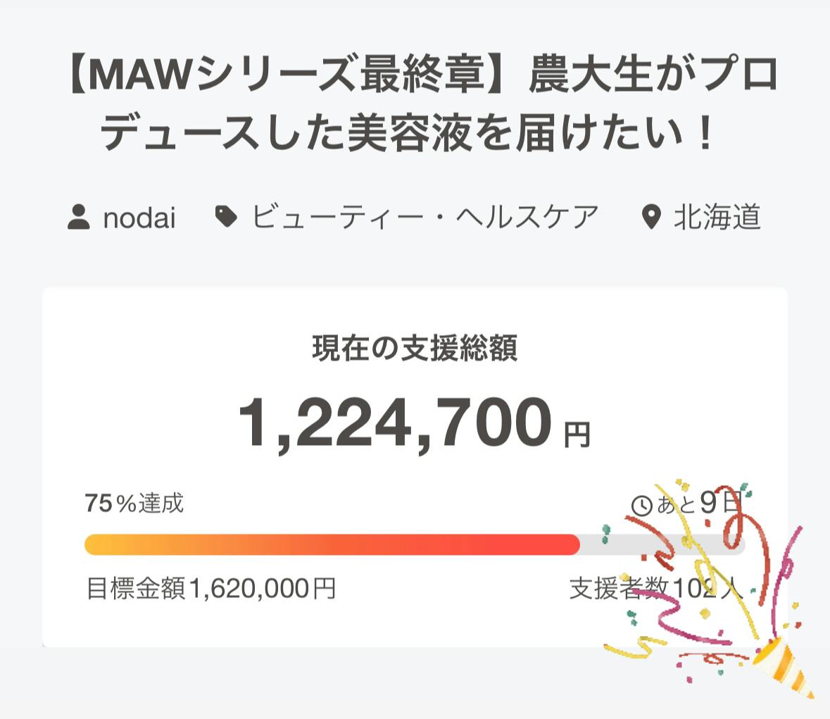 120万円突破とご支援者100名突破しました!ご支援いただいた皆様、ありがとうございます!!私たちの2年間の努力の結晶である美容液を皆様のお手元にお届けできるよう、クラウドファンディング終了まで駆け抜けてまいります!引き続き、応援・ご支援・拡散などなどご協力よろしくお願いします!Mawメンバー一同