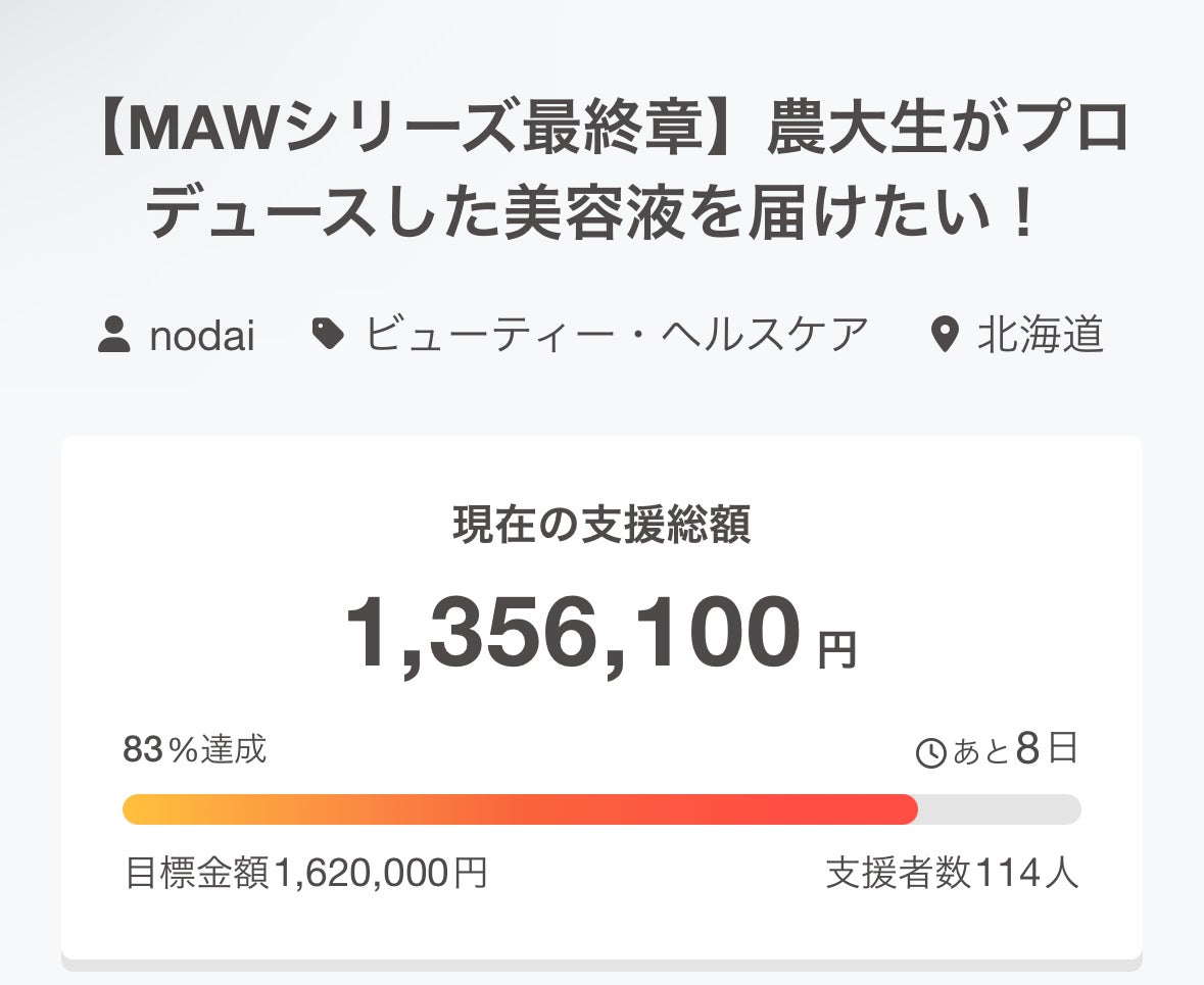 こんにちは。なんと、この度130万円突破いたしました!ご支援いただいた皆様、御礼申し上げます!!目標達成まで30万円きりました!!メンバー一同、この美容液にかける思いが大きく必ず成功させたいと思っています!!そこで皆様の応援やご支援の他にも、周りの方にこの活動をシェアしていただけますと幸いです!皆様のご協力よろしくお願いします!!mawメンバー
