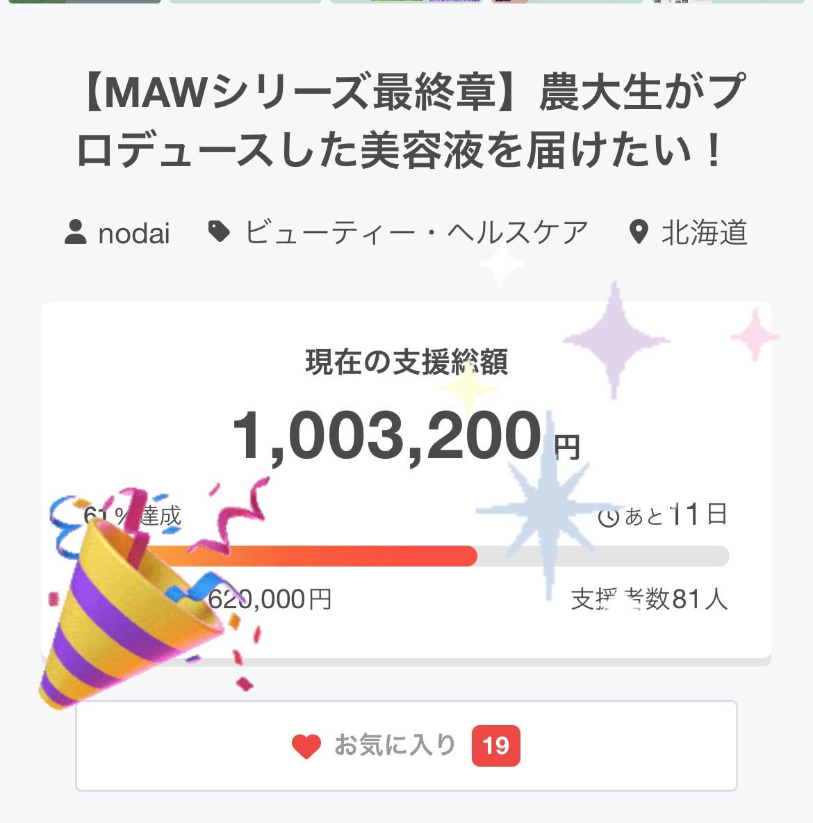 こんにちは。なんと、この度100万円突破いたしました!!!ご支援いただいた皆様、ありがとうございます!!目標金額達成までは残り60万円ほどになりますが、メンバー全員で気を引き締めて、必ず成功させたいと思っています!そこで、この活動について周りの方にシェアしていただけると、とても嬉しいです!ぜひ、応援のほどよろしくお願いします!!mawメンバー