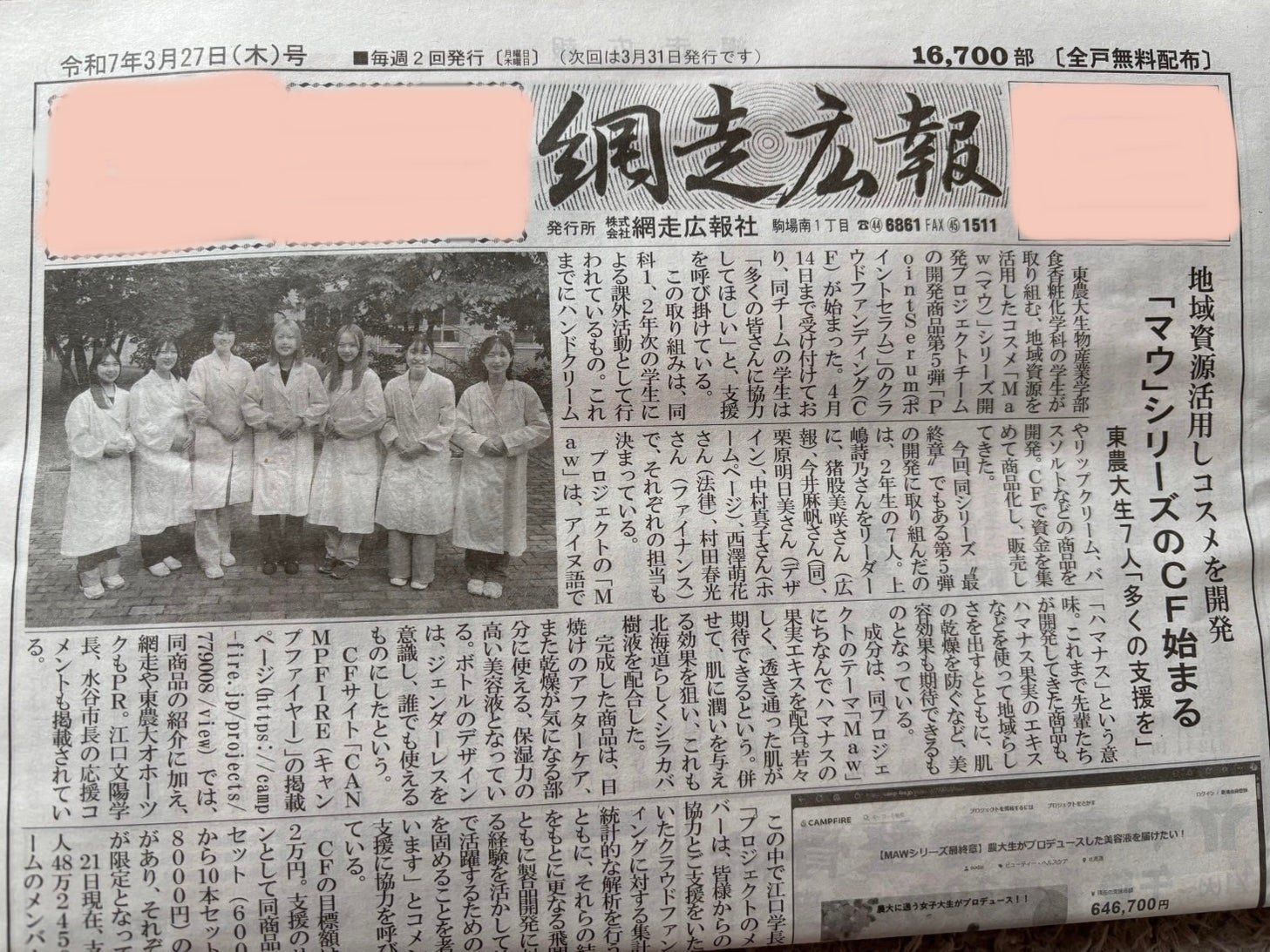 令和7年3月27日発行の網走広報の1面に掲載されました!商品開発でのこだわり等お話させていただきました。網走地域にお住いの皆様、ぜひご覧ください!