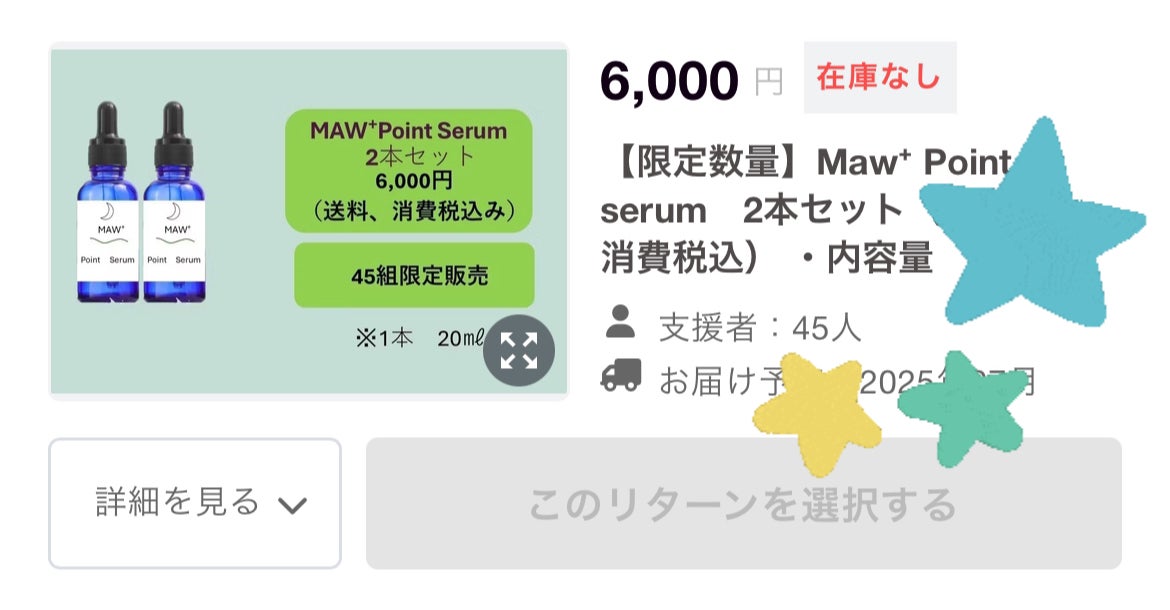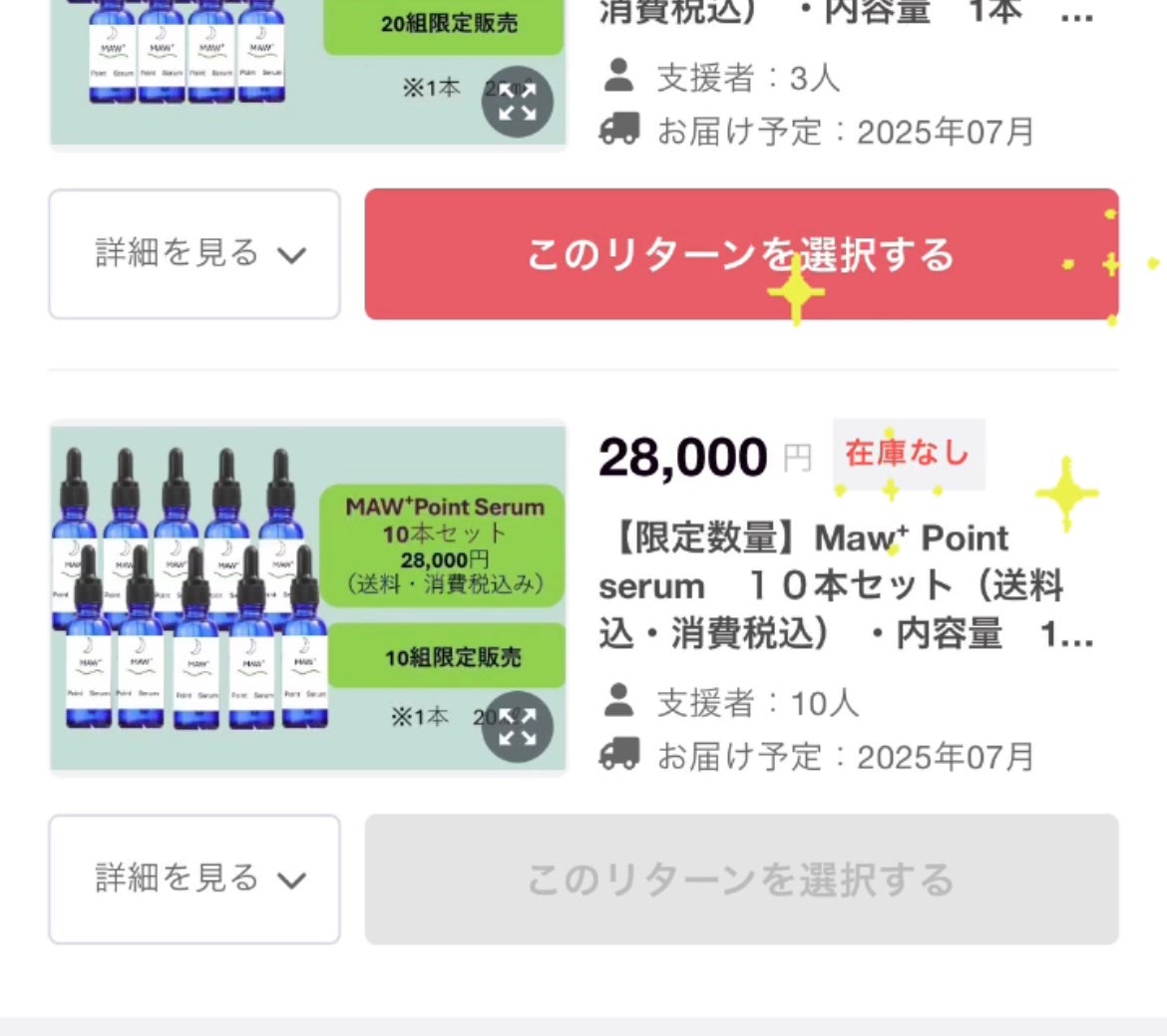 こんにちは。初日からリターン品として出していた2本セットが完売いたしました!!ご支援いただいた皆様、ありがとうございます!!先日、追加で2本セット出しているため、そちらからぜひ、ご支援いただければと思います。残り日数少なくなってきましたが、まだまだ目標達成まで全力で頑張ります!ぜひ、ご支援よろしくお願いします!mawメンバー