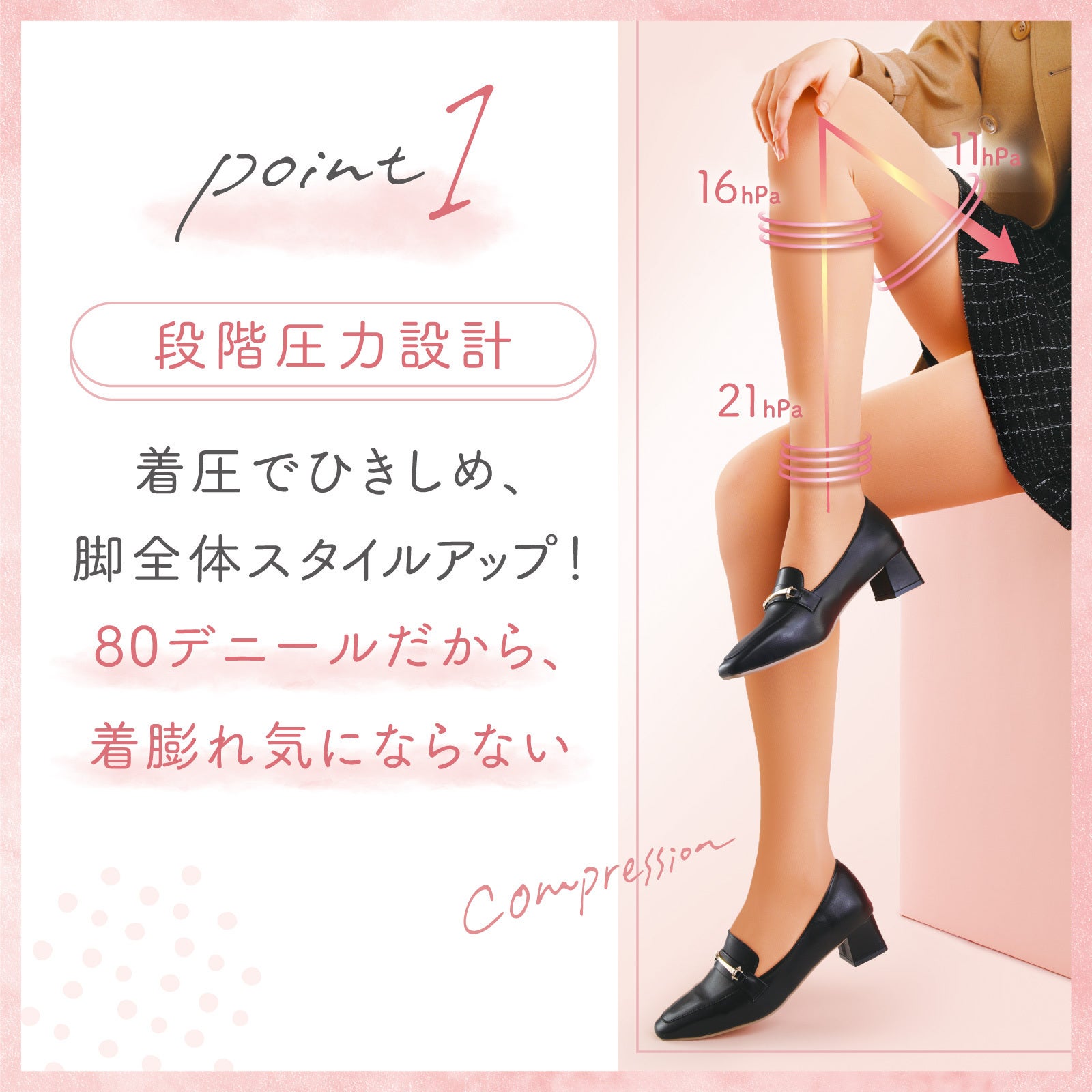 ・段階圧力設計でスッキリ美脚見せ。(足首21hPa、ふくらはぎ16hPa、太もも11hPa)