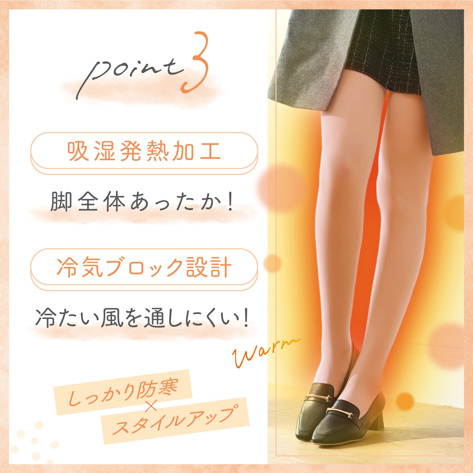 また、吸湿発熱加工を脚全体に施すことで、最終的に暖かさと素肌感を高いレベルで両立させています。
