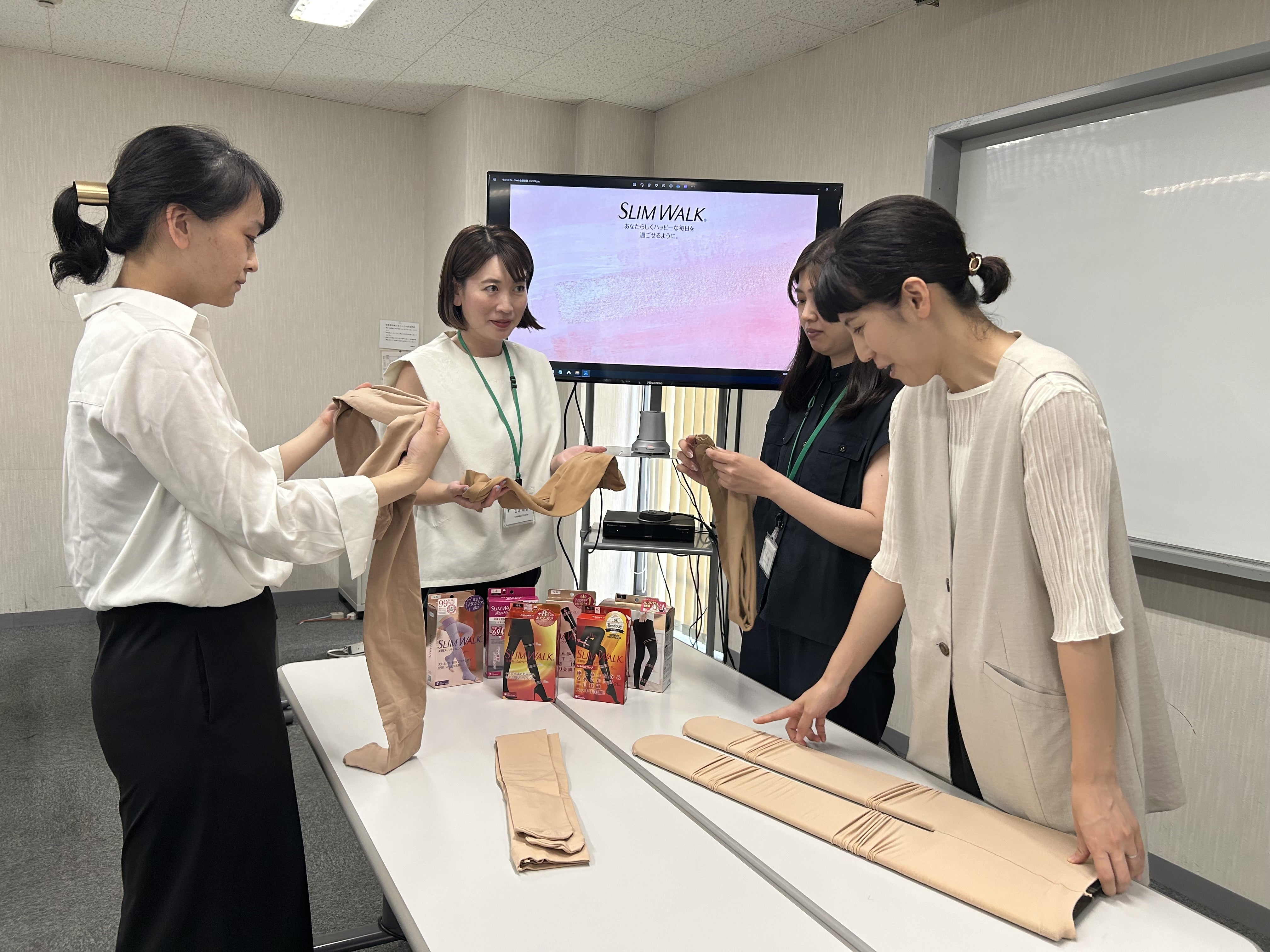 開発途中に、女性社員に着用してもらうと「ババ臭くてこんな色は履けない」と言われ、チームメンバー全員で頭を抱えました。ババ臭くないベージュ…。他社のフェイクタイツも10種類以上履き比べました。