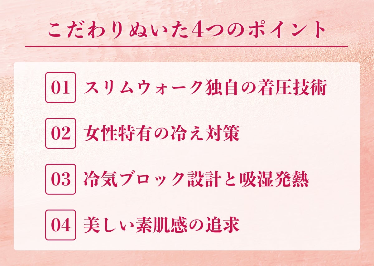 素肌に見えて暖かいというのは一見矛盾するようですが、レッグ部分は冷気ブロック設計を施し、今までのスリムウォークの着圧タイツに比べて、2倍※ 以上風を通しにくく暖かさを実現しています。