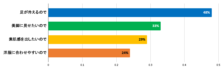 48%の方が「足が冷えるので」という理由でフェイクタイツを選び、33%が「美脚に見せたいので」と回答。