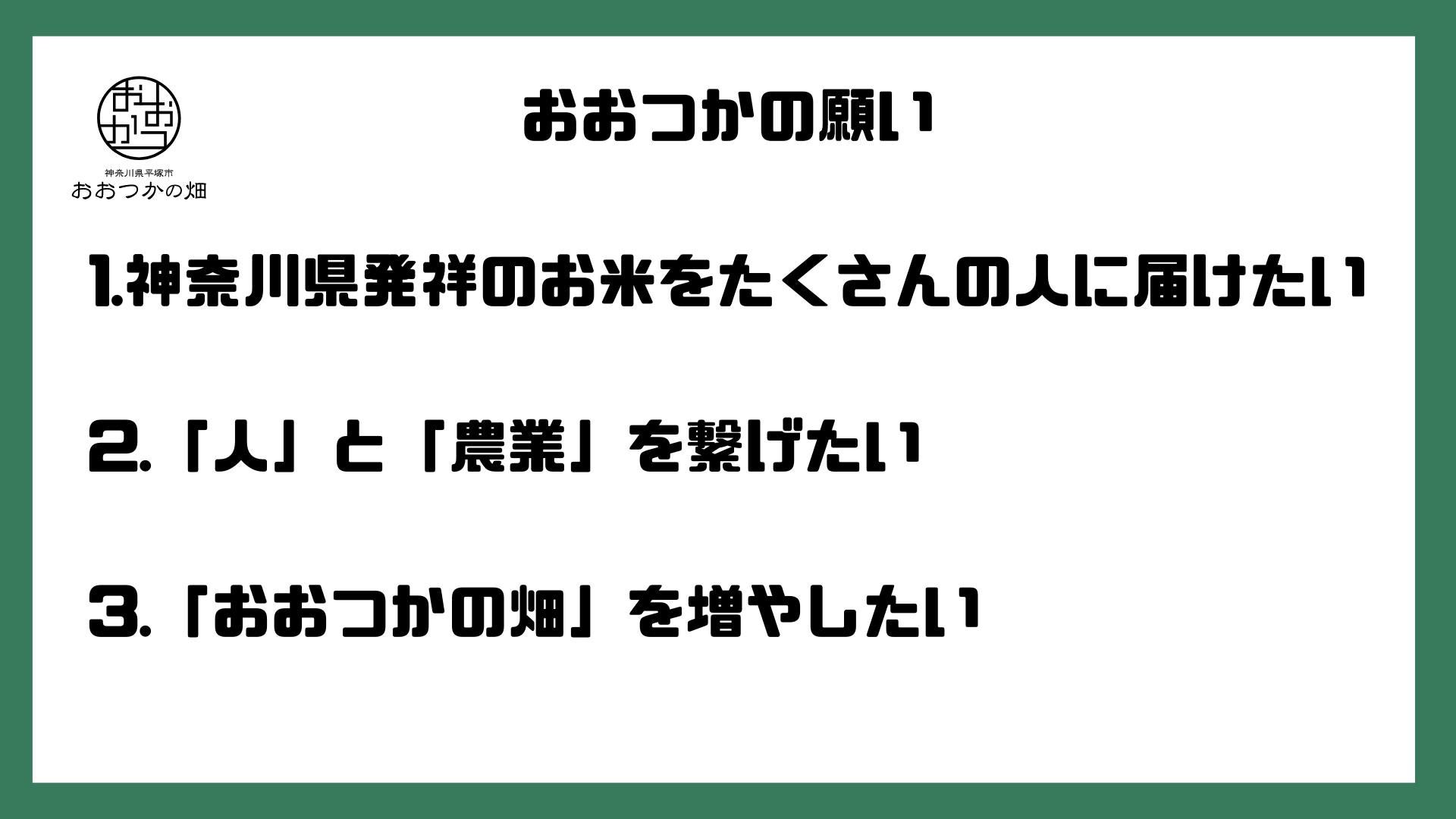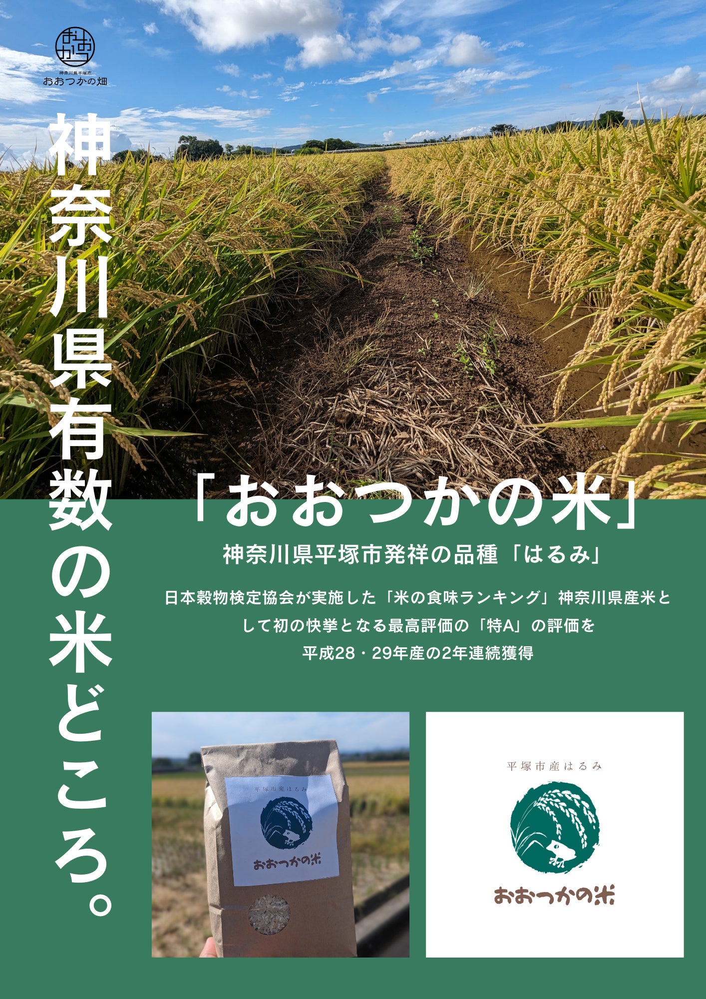 皆さんは湘南にも米どころがあることをご存じでしょうか、首都にほど近いここ神奈川県にもずっと昔から米どころがあるんです。そんな神奈川県有数の米どころから生まれた平塚市産「はるみ」を使った自社ブランド「おおつかの米」を多くの人に届けたい。そして、首都圏にある農地としてもっと農業を身近に感じれるよう、「人」と「農業」を繋げる役割を担いたい!そんな願いを一緒に叶えてくれる人、、、そう!「おおつかの仲間」を募集します!
