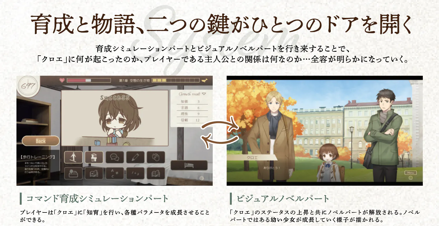 本作は育成シミュレーション+ノベルアドベンチャーゲームとなっており、特徴としては「退廃」や「儚さ」をコンセプトとした全編バッドエンドの育成ゲームです。