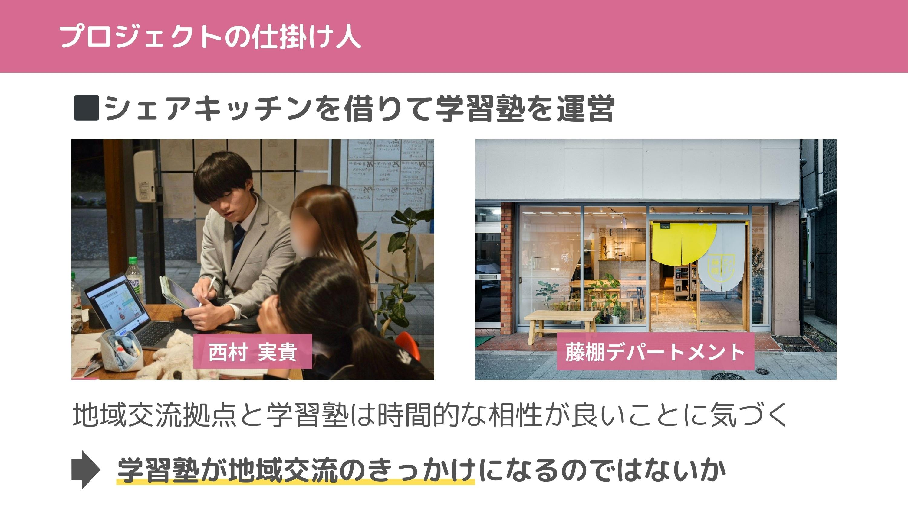 シェアキッチンを借りて塾をやっている状態でしたが、逆ができたらとても面白いなと考えるようになりました。つまり、夕方は塾にして、昼間の使われない時間を、シェアキッチンや地域交流拠点として開放できたら、とても良いのではないかと考えました。