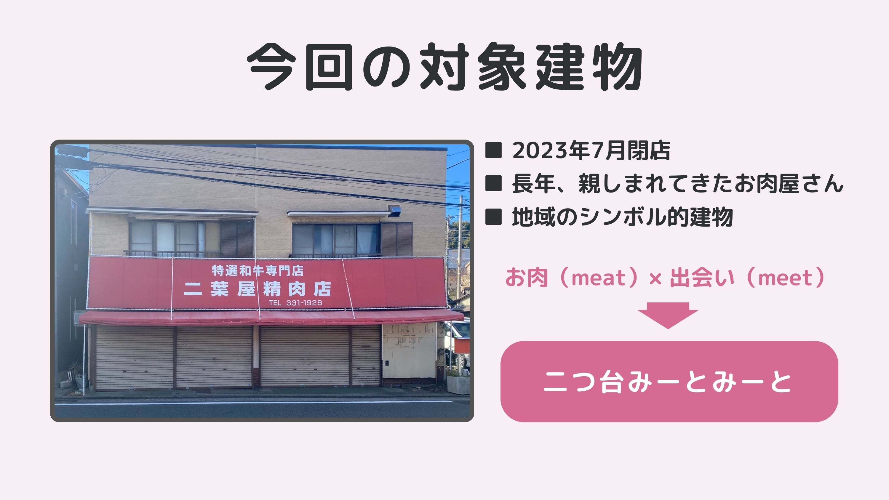 そこで今回は、二つ台地域で閉店してしまったお店の一つである「二葉屋精肉店」を改修し、生まれ変わらせようと考えています。