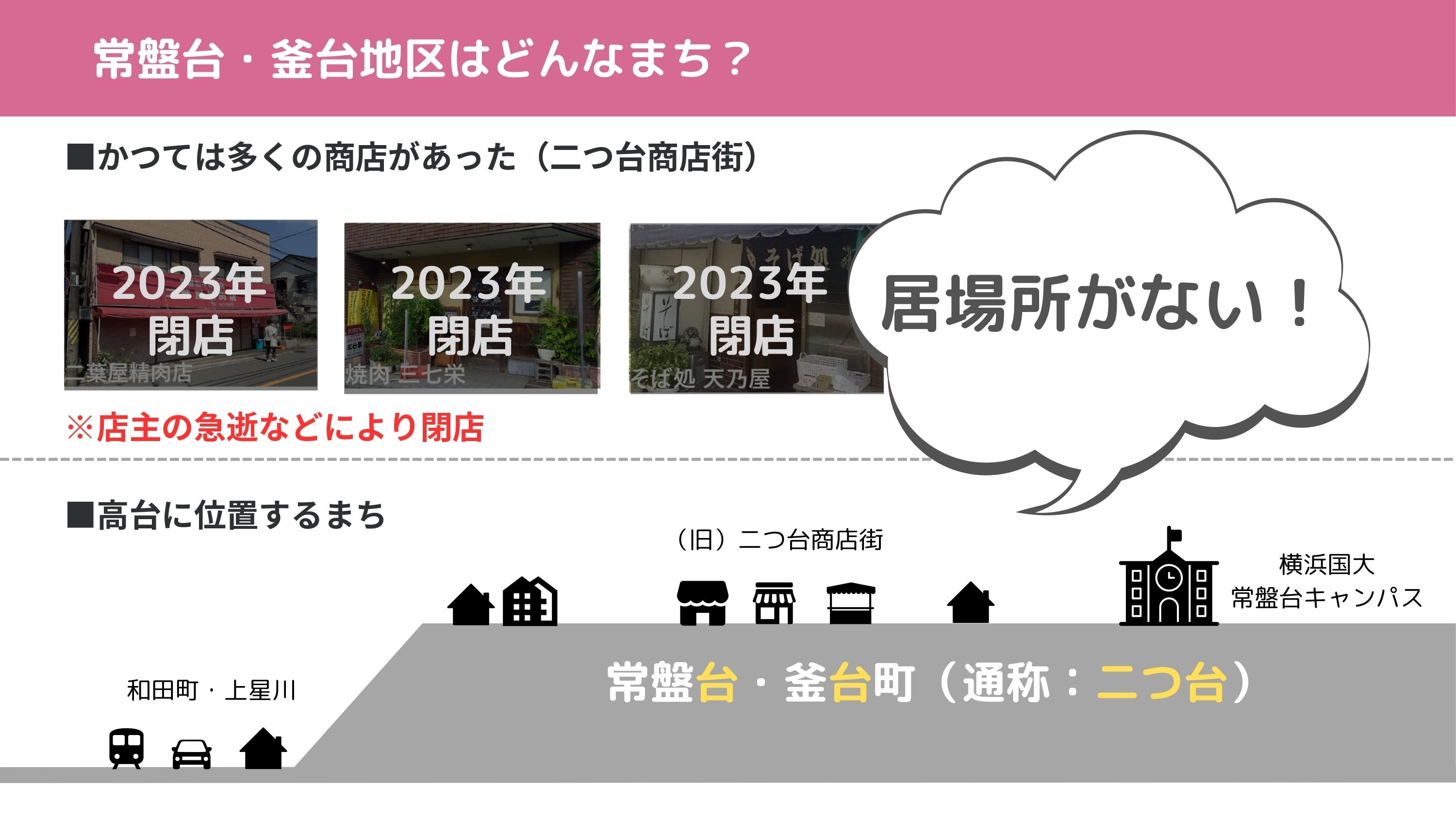 高台の上のお店が無くなってしまったので、急峻な坂を登り降りしないと飲食店・カフェすらないという地域となってしまいました。人々がふらっと集まれる居場所が不足しています。