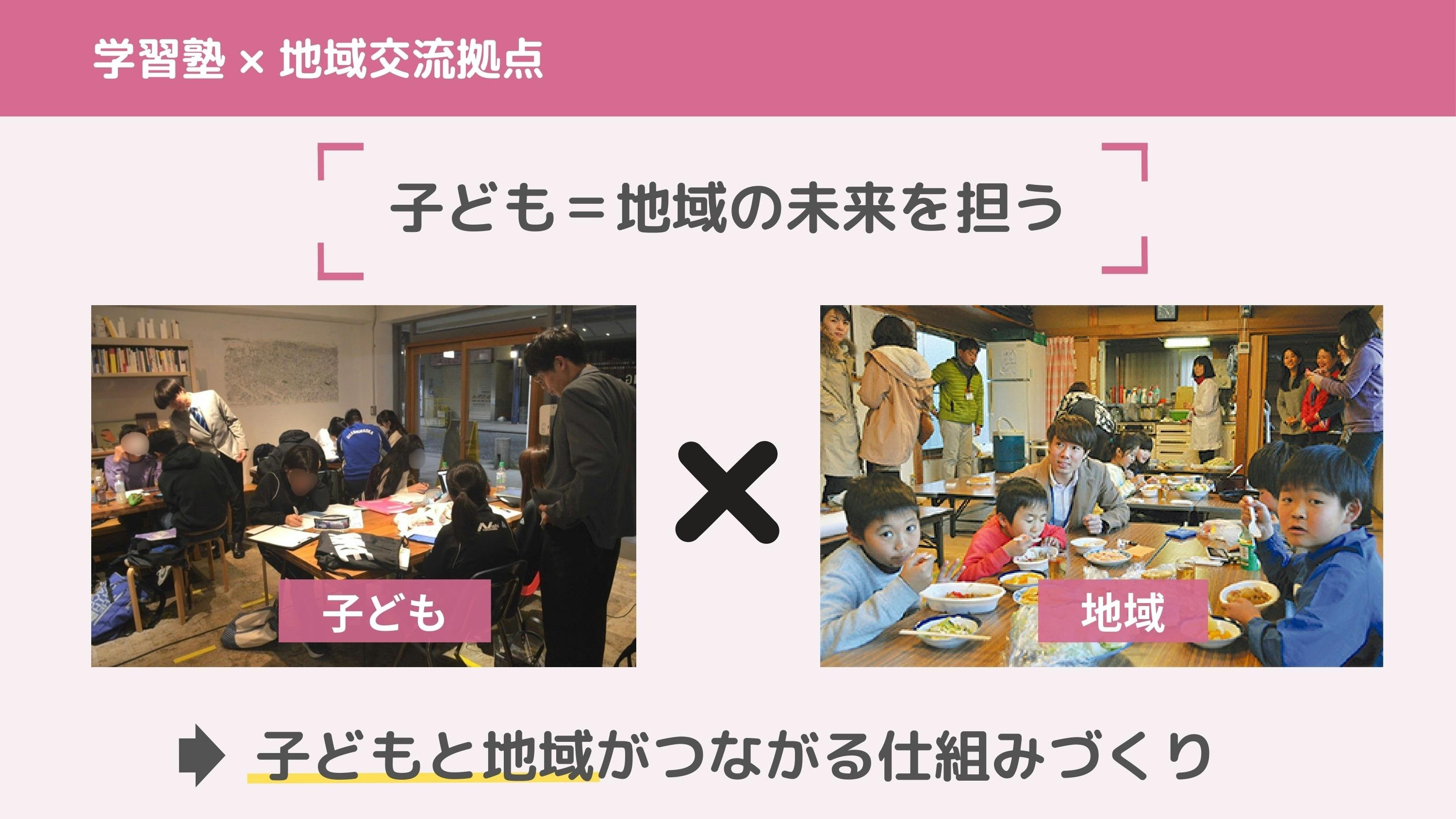今回のプロジェクトは、学習塾と地域交流拠点が共存することで、場所を有効活用し、家賃などの維持費を負担しあうことで継続性を高めることを可能にしています。