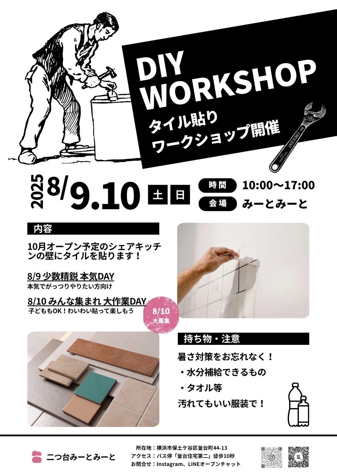 2025/08/06 22:44【ご支援ありがとうございます!】このたびは、二つ台みーとみーとプロジェクトに温かいご支援をいただき、本当にありがとうございます。皆さまのお力添えのおかげで、ついにキッチン工事が始まります!【土日はDIYで一緒につくりませんか?】せっかくの拠点づくり、私たちだけでなく、地域や支援者のみなさんと一緒に手を動かしながら作り上げたいと思っています。DIYが初めての方も大歓迎!スタッフが道具の使い方から丁寧にお教えします。1日だけの参加もOK、途中参加・途中退出も大丈夫です。【ワークショップ日程】 8/9(土), 8/10(日) タイル貼り 8/16(土) 裏開口ぶち抜き 9/13(土), 9/14(日) 壁左官仕上げ 9/27(土), 9/28(日) カウンター天板づくり 10/4(土), 10/5(日) シャッター塗装 【場所】横浜市保土ケ谷区釜台町44-13 旧二葉屋精肉店(横浜国大西門すぐ・赤い看板が目印)【持ち物】汚れても良い服装、軍手(道具は貸し出しあり)一緒にこの場所をつくる楽しさを味わいませんか?現地で皆さんにお会いできるのを楽しみにしています! もっと見る【イベント予告】3/1(土)「確定申告講座」をみーとみーとで行います!