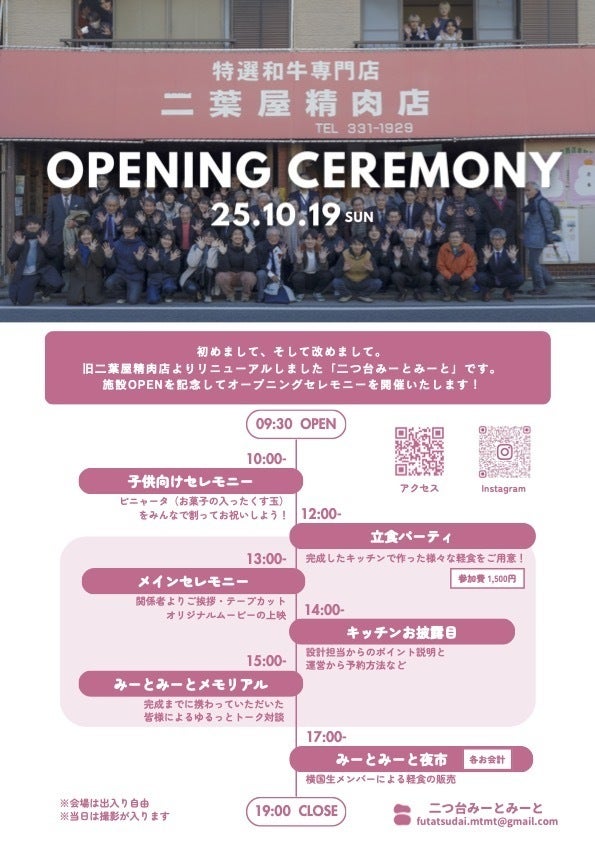 2025/08/26 16:00このたびは「二つ台みーとみーと」プロジェクトに多大なるご支援を賜り、誠にありがとうございます。皆さまのお力添えにより、旧二葉屋精肉店をリニューアルした新しい地域拠点「二つ台みーとみーと」がついに完成いたしました。心より御礼申し上げます。つきましては、施設の完成を記念し、下記の通りオープニングセレモニーを開催いたします。子どもたちも楽しめる企画から、地域の皆さまと共に歩む第一歩を祝うメインセレモニーまで、一日を通じて多彩なプログラムを予定しております。【オープニングセレモニー概要】 日程:2025年10月19日(日) 時間:9:30 OPEN ~ 19:00 CLOSE 会場:二つ台みーとみーと(横浜市保土ケ谷区釜台町44-13 1F) プログラム(予定) 10:00 子供向けセレモニー「ピニャータ」 12:00 立食パーティ(ご来賓1,000円/一般1,500円) 13:00 メインセレモニー(ご来賓紹介・代表挨拶・テープカット 等) 14:00 キッチンお披露目・施設説明 15:00 「みーとみーとメモリアル」トークセッション 17:00 「みーとみーと夜市」屋外での軽食販売 19:00 クロージング 今回のオープニングセレモニーは、支援してくださった皆さまにとってもプロジェクトの成果を直接ご覧いただける機会です。ぜひ当日はお気軽にお立ち寄りいただき、完成した施設の雰囲気を実際に体感していただければと願っております。ポスター画像も添付しておりますので、ぜひご覧ください。これからも「二つ台みーとみーと」が地域に根差した居場所となるよう、一歩ずつ歩みを進めてまいります。引き続き温かいご支援、ご声援を賜れますと幸いです。二つ台みーとみーと運営一同futatsudai.mtmt@gmail.com もっと見る