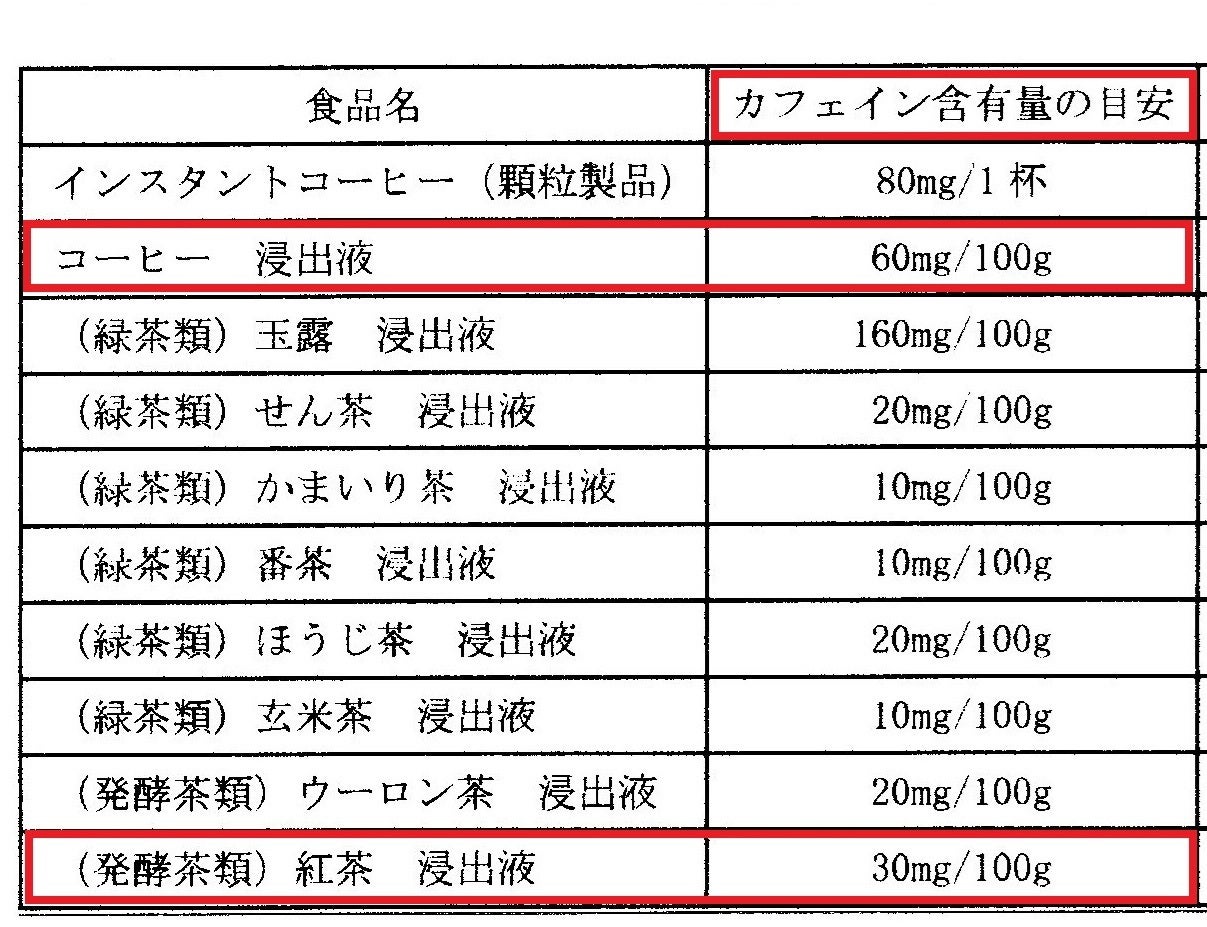 紅茶葉カフェインが多いと思い込みされている方が多いですが、画像の比較表でお分かりの通りコーヒーの約半分のカフェイン量です。紅茶に関して多くの誤解があります。発酵方法、牛乳が先か後か?、紅茶・中国茶・着香茶(フレーバーティー)の違い、紅茶の良し悪しなどなど・・・紅茶の良し悪しは茶葉の大きさではなく、8分以上蒸らして雑味(えぐ味、苦みなど)がないこと、アイスティーにしても味が薄まらないことが簡単な良し悪し判定方法です。