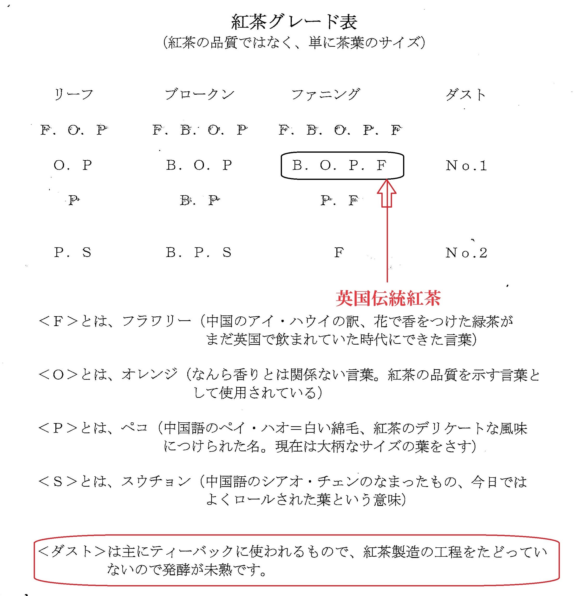 紅茶のグレードは品質ではありません。茶葉の大きさを分けているもので、FOP~BOPFへストレートで飲むかミルクインで飲むかなど好みでグレード分けされた茶葉を選ぶことになります。英国はミルクイン!BOPFサイズを好んでます。B(ブロークン)、O(オレンジ)、P(ペコ)、F(ファニング)と訳します。ファニングは抹茶!味にコクが出て、ミルク感のない紅茶になります。因みにFOPのFは(フラワリー)と訳します。茶葉の大きいから良い紅茶葉というのは誤解です。茶葉の良し悪しは、口に残る渋み(えぐ味)、苦みなど雑味のないことが良質の紅茶葉となります。10分以上蒸らしも雑味がなく味が変わらない紅茶葉を選びましょう。氷を入れても味が薄まらない紅茶葉は最上級!