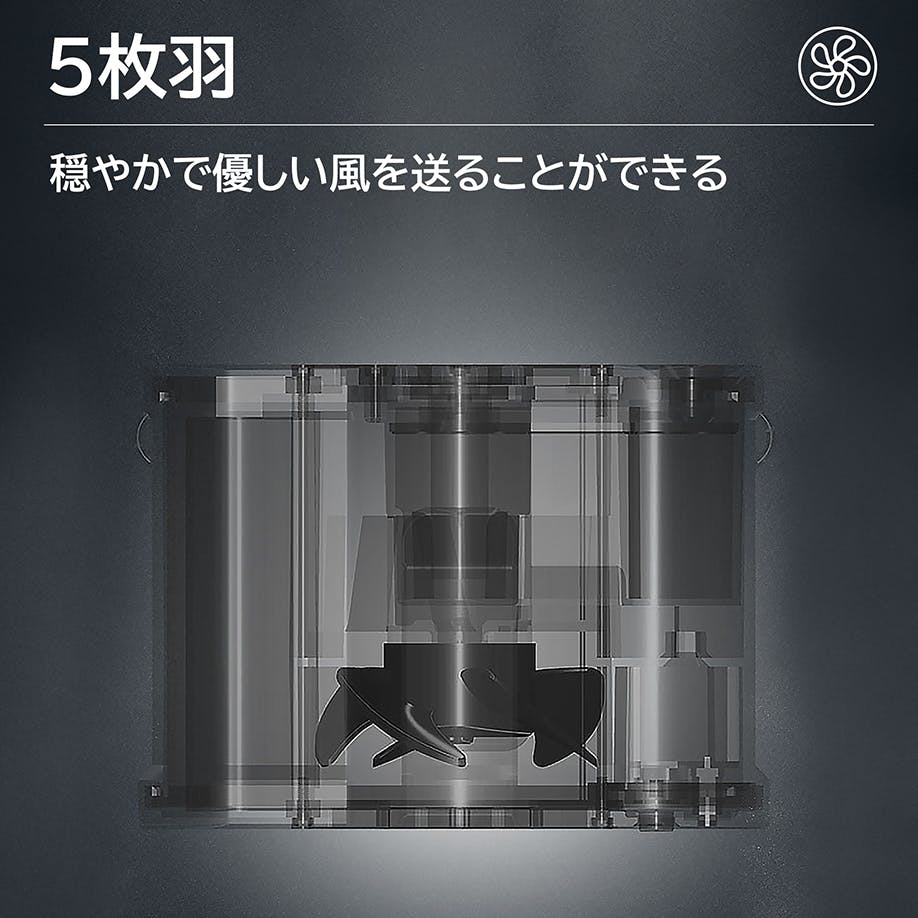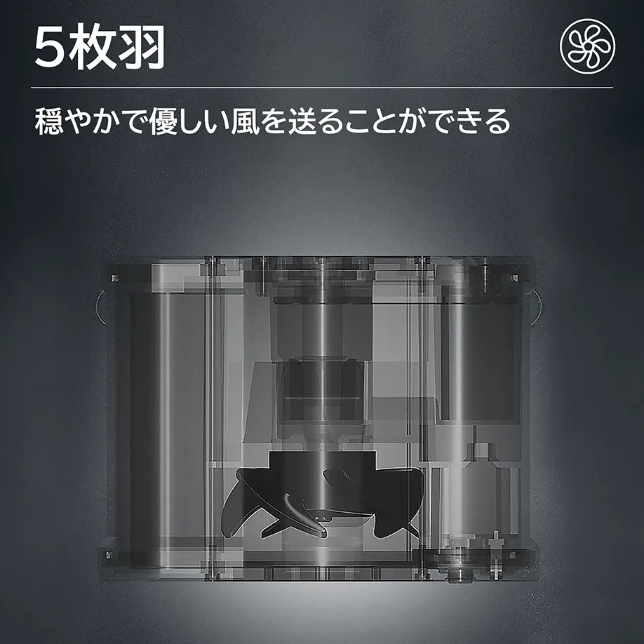 送風構造は5枚羽を採用し、一般的な3枚羽の扇風機より穏やかで優しい風を送ることができるため、体に負担がかかりにくいです。