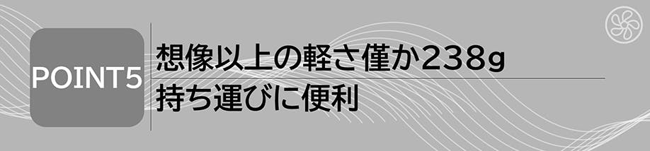 従来型と比べて高性能なのにも関わらず、ほぼ重量感を感じられない238gの軽量さ。