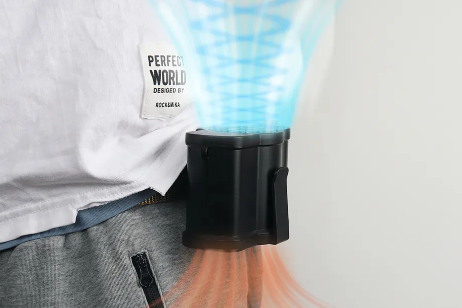 「WalkFan4.0」の両側には服やベルトに固定できるクリップが付いています。またストラップで首にかけて利用することもでき、両手を解放し、歩きながら涼しい風を楽しめます。