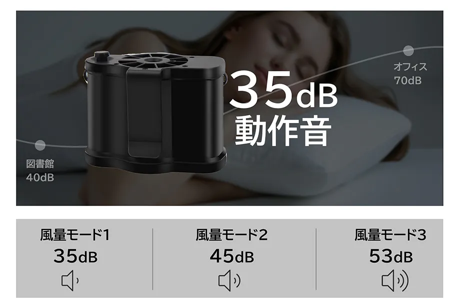 ※50cmからの作動音測定値は風量モード1が35dB、風量モード2が45dB、風量モード3が53dBとなります。