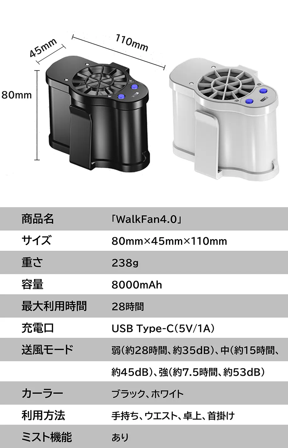 「WalkFan4.0」の内蔵バッテリーは8000mAhを搭載し、最大28時間の使用が可能です。最大風速でも7.5時間以上の連続稼働ができ、1日の使用に十分です。