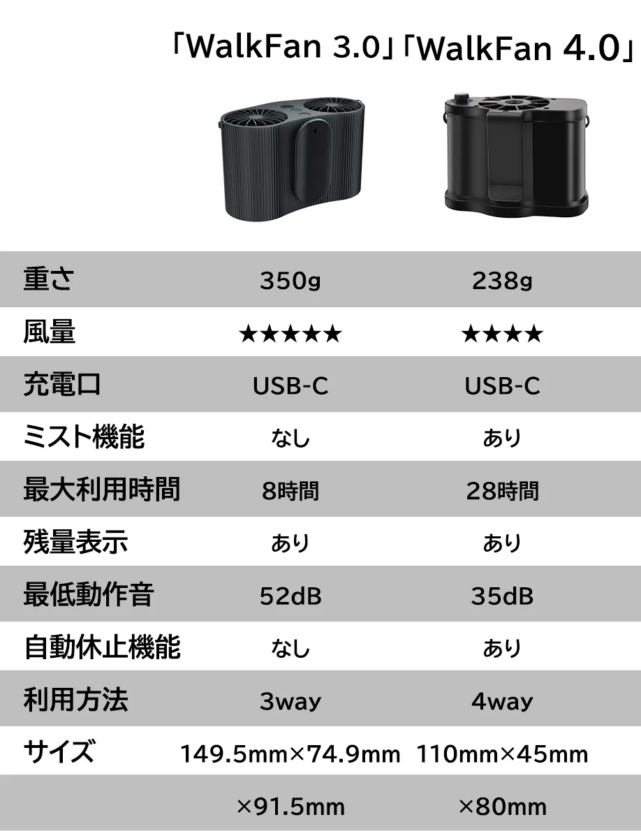 「WalkFan4.0」にはミスト連続噴射モードとミスト半連続噴射モードの二つがあります。環境の暑さによって自由に冷風効果を選択できます。