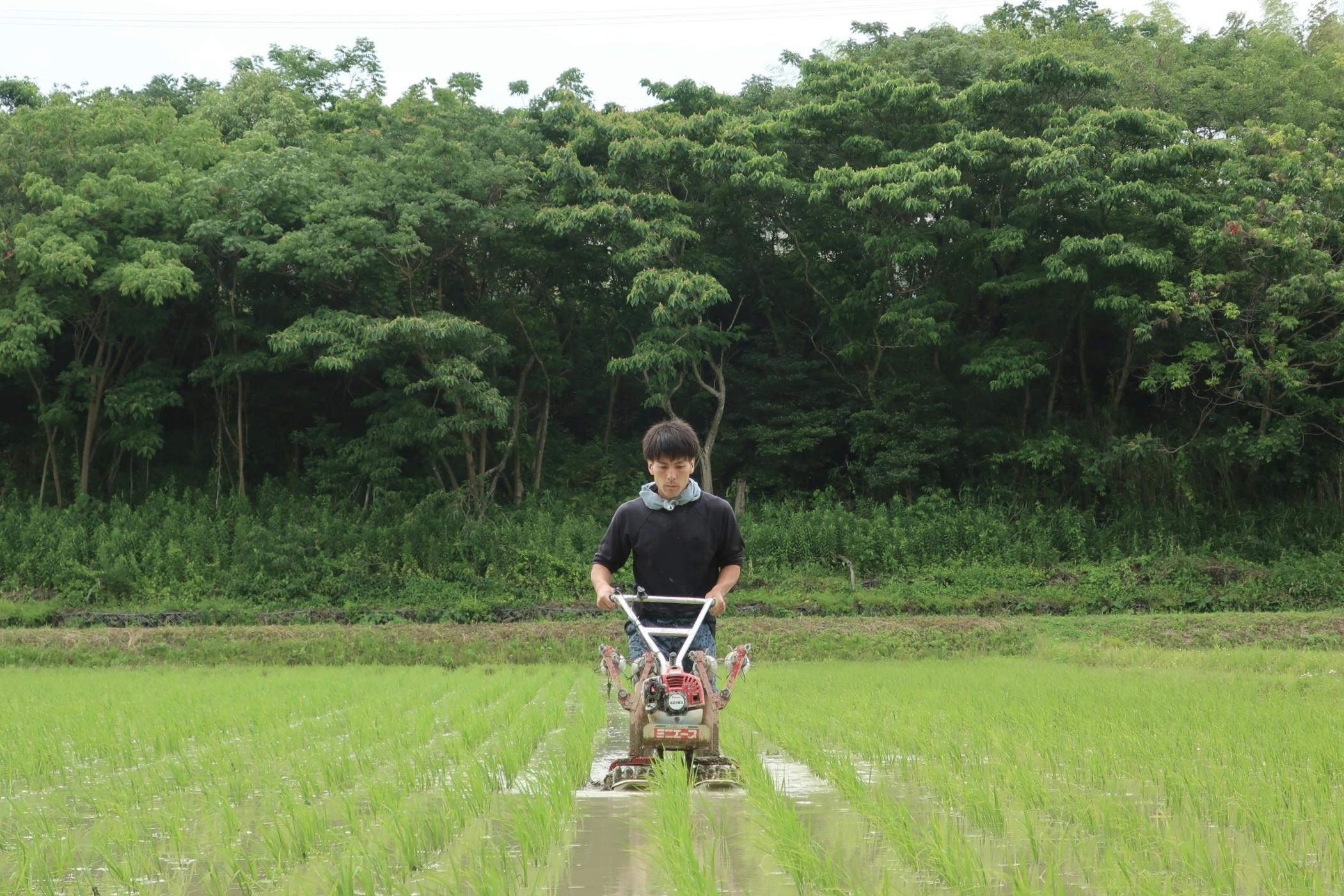 稲が小さいうちは手押しのエンジン式除草機を使って、田んぼの隅々まで繰り返し除草します。それでも取りきれない雑草は、田んぼに入り手作業で除草を毎日のように行います。