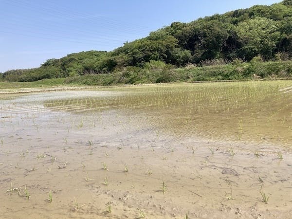 こんばんは。出口農園です。今回は、無農薬でのお米づくりにおいて、最大の難所とも言える「草」との向き合い方について、ご報告いたします。一般的な稲作では、田植えの前後に除草剤を撒いて草を抑えますが、私たちは農薬や除草剤を使わずに栽培しています。そのため、草をいかに生やさず、稲を守り育てていくかが、とても大きな課題になります。草の発芽を防ぐには、「田んぼにしっかり水を張っておくこと(深水管理)」が基本中の基本。田植え後、私たちは毎日すべての田んぼを巡回して、水が抜けていないかを細かくチェックしています。とはいえ、田んぼごとに状況は本当にさまざまで・・・。バルブをひねればすぐに水が出る恵まれた場所もあれば、ポンプを使って一所懸命くみ上げなければならない場所もあります。水が抜けていく原因の一つが、ザリガニなどの生きものが開けてしまう小さな穴。これが曲者で、水はどんどん抜けていき、見回っていないと、知らないうちに土が乾いてしまいます。そうすると草の種にスイッチが入り、あっという間に芽が出て、生育途中の稲の大敵になってしまうのです。だから私たちは、水の音を聞き分けたり、田んぼの表面を目で観察したり、穴を探し当てて、スコップなどで塞ぎ、また次の田んぼへ見回っていく・・・。田んぼとの“対話”のような日々を繰り返しながら、稲の居心地のよい環境を整えています。今年は昨年の5倍、約10町歩の田んぼを耕作しており、初めて経験するトラブルにも直面していますが、「このお米が、未来の子どもたちの給食に届くかもしれない」そんな希望を胸に、一歩一歩進んでいます。次回は、そんな草との本格的な格闘戦「除草作業」の様子をご報告させていただきます。ぜひ、楽しみにお待ちください!!いつも応援してくださる皆さまに、心からの感謝を込めて。