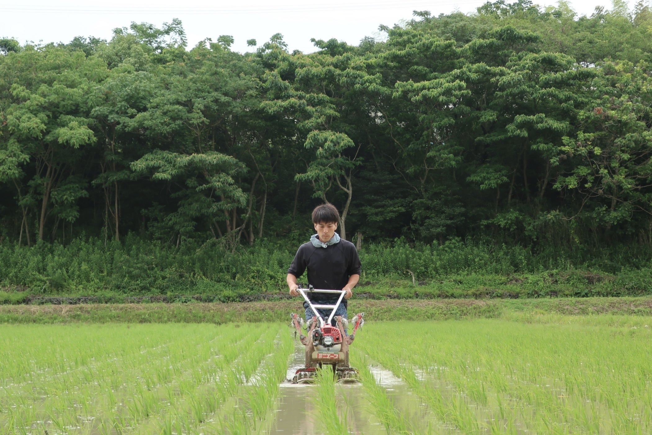 田植えをする直前に2回目の代かきを行い、すくすく健康に育った苗を田んぼに植えていきます。田植えを行った約1週間後から除草機を手で押し歩き、草の芽が小さいうちに除草します。