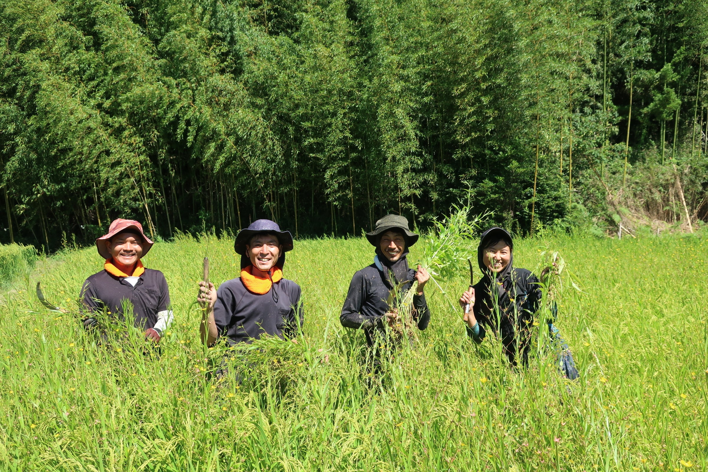 ジリジリと刺すような日差しが照りつける日はもちろん、雨が降ろうが風が吹こうが、稲が育つまで来る日も来る日も、汗と泥にまみれて何時間も草を抜き続けます。農薬や除草剤を使わない米づくりは、「無限に続く雑草との格闘」です。