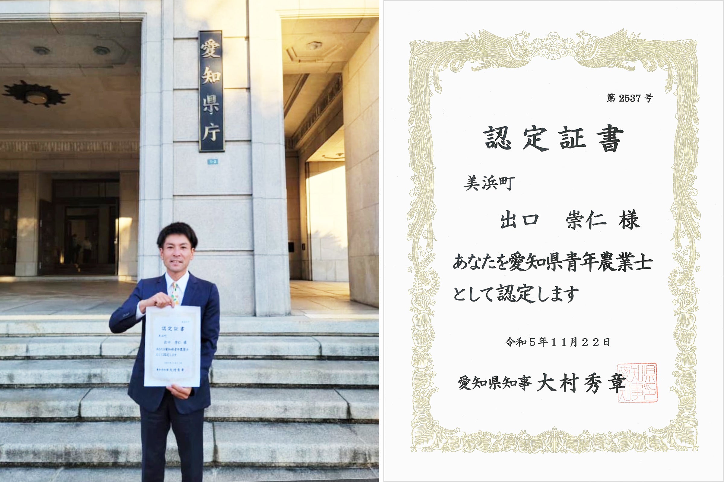 そのような活動が認められ、昨年2023年には次代の中核的農業者を目指す農業青年として「青年農業士」としての認定証書を愛知県知事から授与されました。授与式では、「地域において先進技術の導入など、他の農業青年の模範となる経営に取り組み、農業の発展のために寄与していきたい」と愛知県知事に話をさせていただきました。