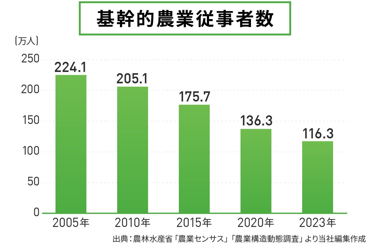 今の日本の農業は農家の高齢化により、農業を辞める人が増えています。農林水産省の発表によると、2010年の農業人口が約260万人だったのに対し、2023年には116万人と半分に減っており、その流れは止められないといわれています。