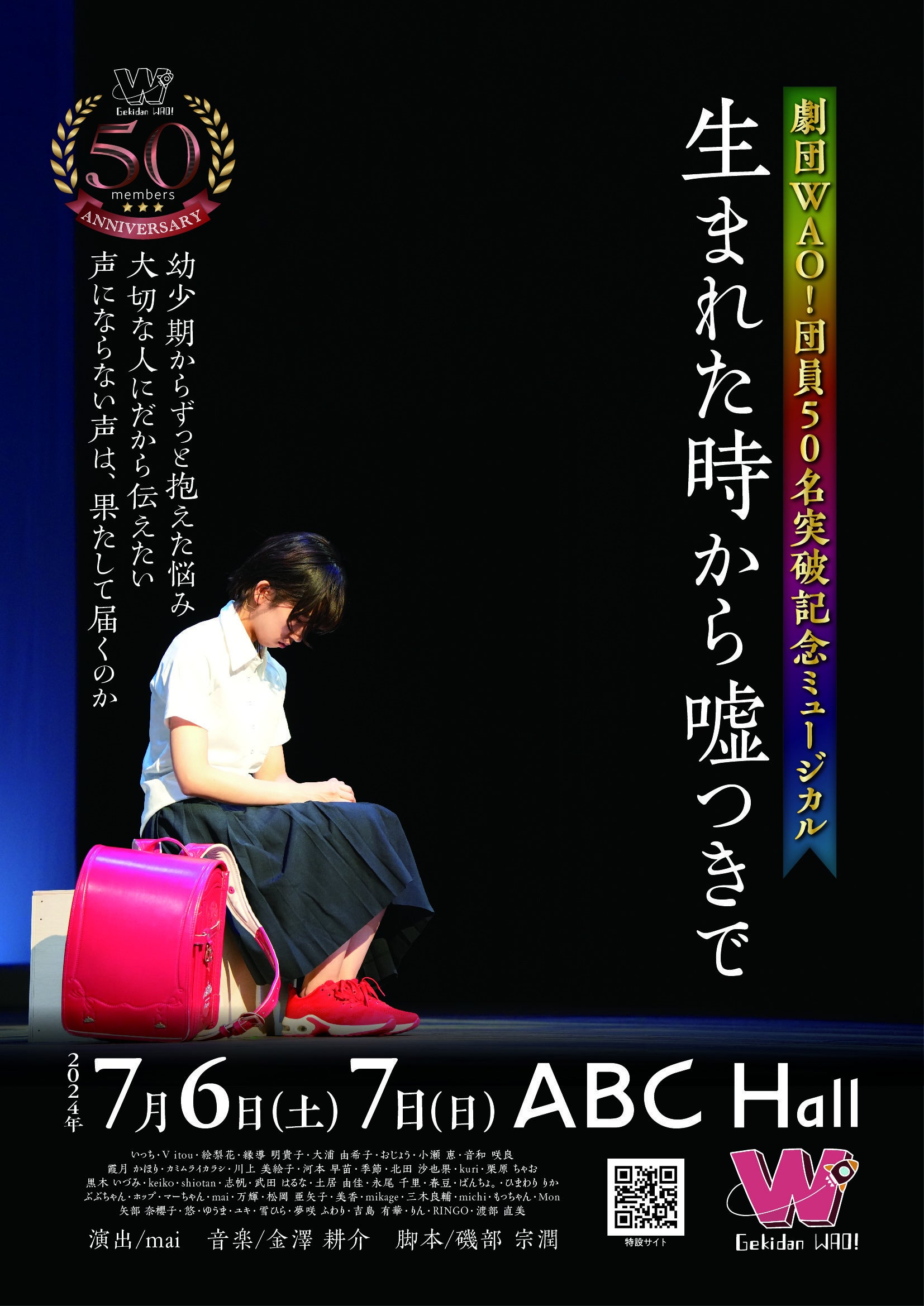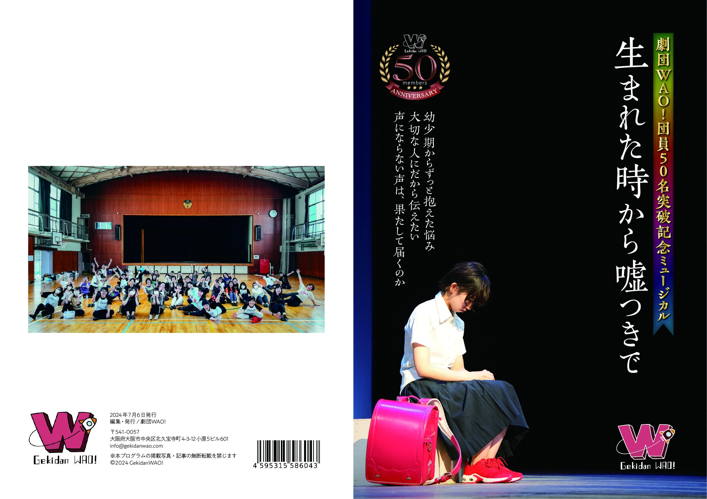 今回の公演は劇団WAO!団員50名突破記念公演として、大阪でも名高いABCホールにて開催いたしました。劇団WAO!のミュージカルはいつも大切にしていることがあります。上記にも記載させていただいた通り、あの頃起き忘れた夢を叶える場所として存在し、演者のステージに立つという夢を叶え続けています。そんな中、演目に選ぶのは何か社会に伝えたいメッセージがある人や活動家の方の半生です。また、過去の偉人とかではなく今現在活動真っ最中の方を選んで脚本を書いております。毎回舞台後のご本人登場も欠かせない一つのイベントとなっております。今回の演目はLGBTQをテーマにしたお話です。幼少期に性と体の不一致、違和感に気づき始め生きづらさ、大好きな親に自分の声を届けにくいと、悩み苦しみ生きてきた竹紫春翔さんのお話です。彼は体が女性、心は男性というトランスジェンダーです。今は絵本を出版し、みんなそれぞれ個性があっていいんだよと、悩める方達、またはそういった家族や友人を持つ方々にメッセージをお届けされています。そんな彼の話を舞台にし、今また、その動画配信の企画を進めております