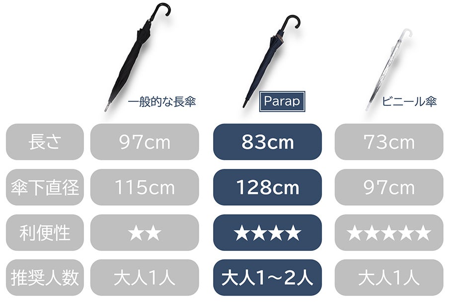 Parapは小柄のビニール傘のサイズ感ですが、傘下直径は驚きの128cmを誇ります。