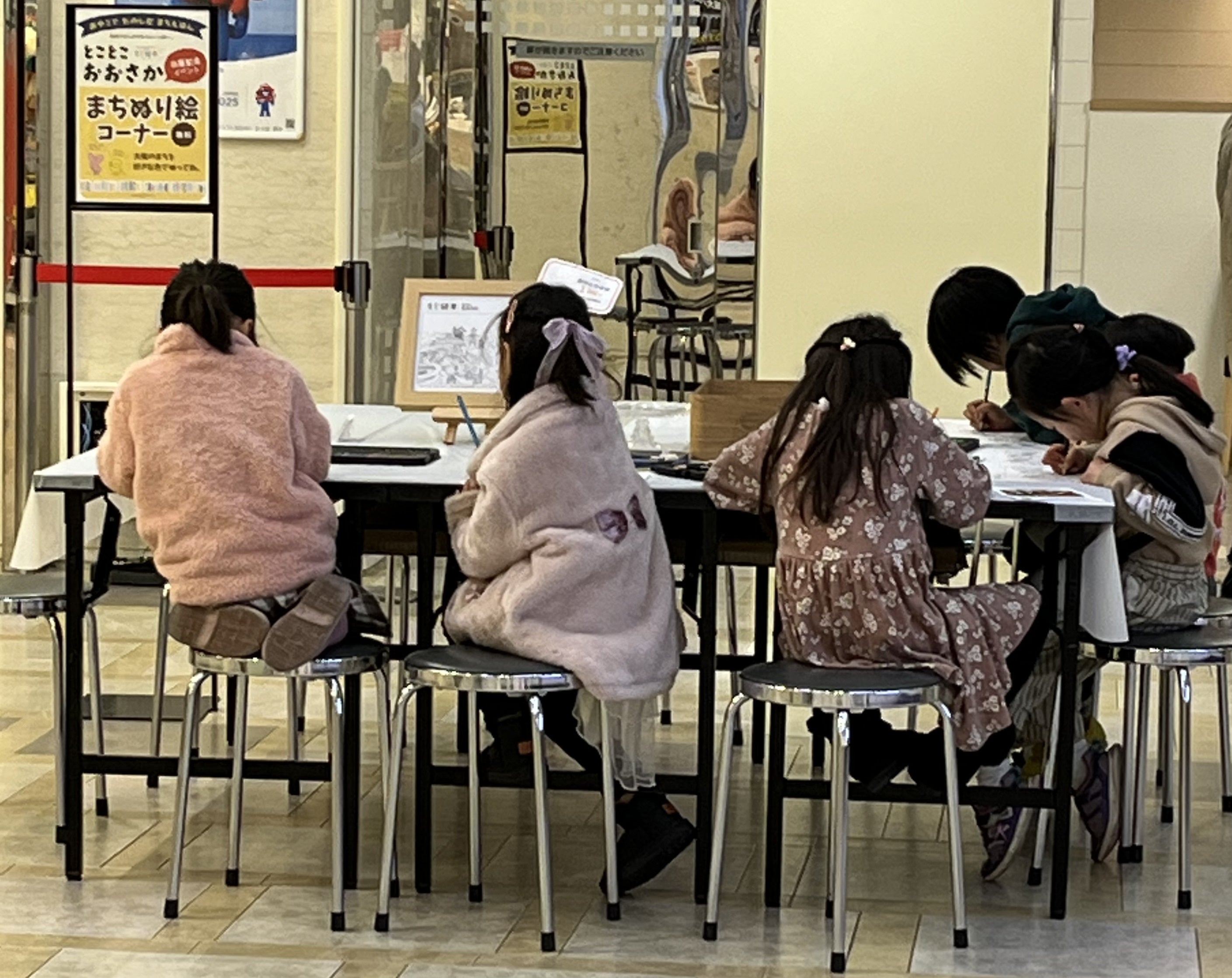 まちぬり絵コーナーでは、子どもたちが大阪のまちを好きな色に塗ってオリジナルのイラストページを仕上げてくれましたよ。