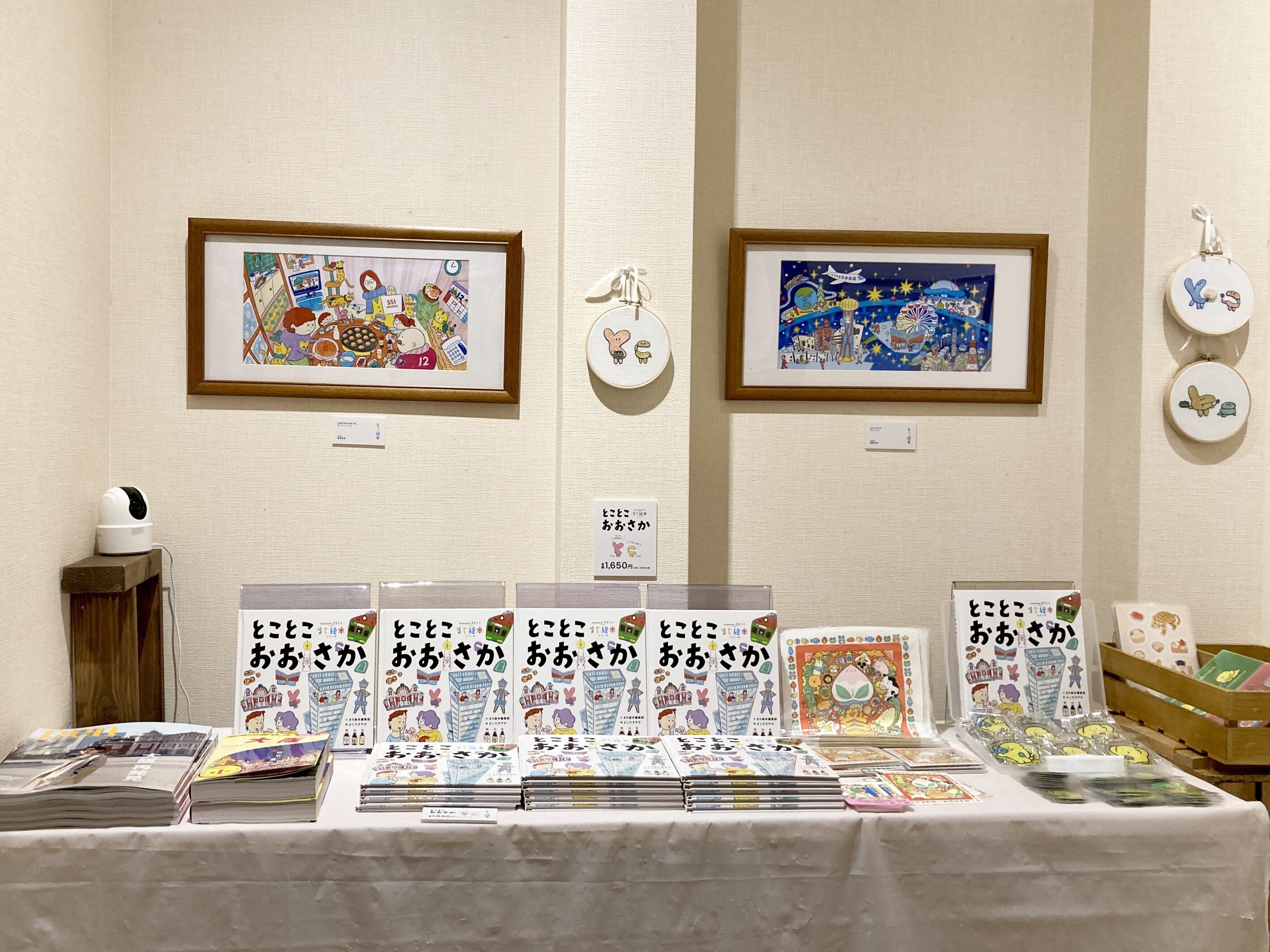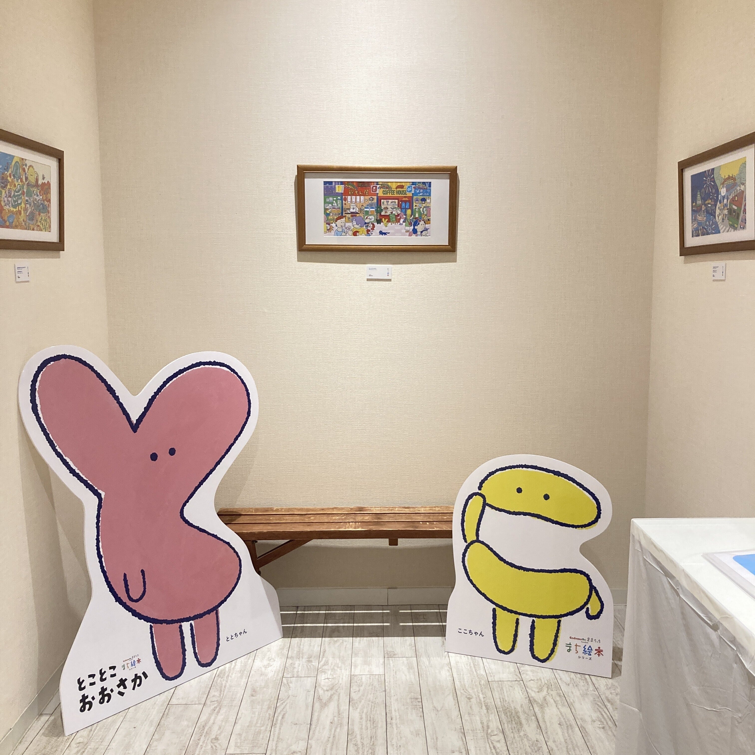 原画の展示、絵本ができるまで、よしださんのグッズなどもあります。ととちゃんここちゃんパネルと、ぜひ一緒に写真を撮ってくださいね!
