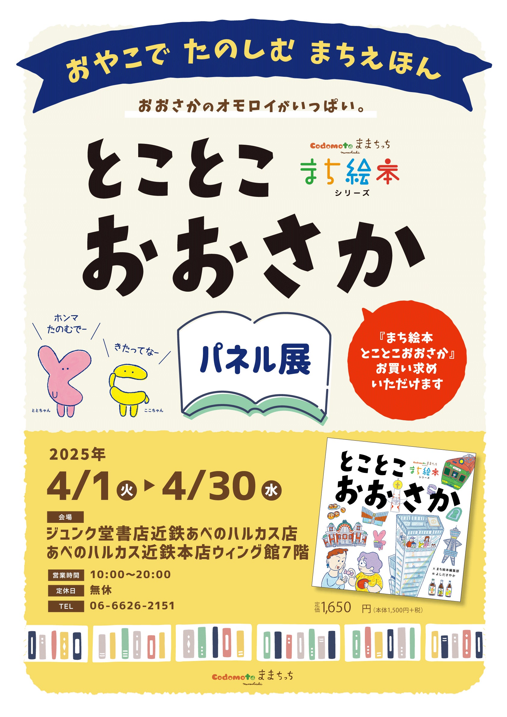 この度、ままちっちと同じく阿倍野区にあります、ジュンク堂書店近鉄あべのハルカス店さんにて1ヶ月間「まち絵本とことこおおさか」のパネル展示をさせていただくことになりました!