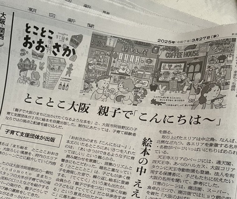 先日、朝日新聞の方が阿倍野区昭和町にある子育てひろば「ふらっとひろば」にて、まち絵本について取材をしてくださいました。その取材が、3/27(木)朝日新聞朝刊(大阪エリアの地域誌面)に掲載されました!