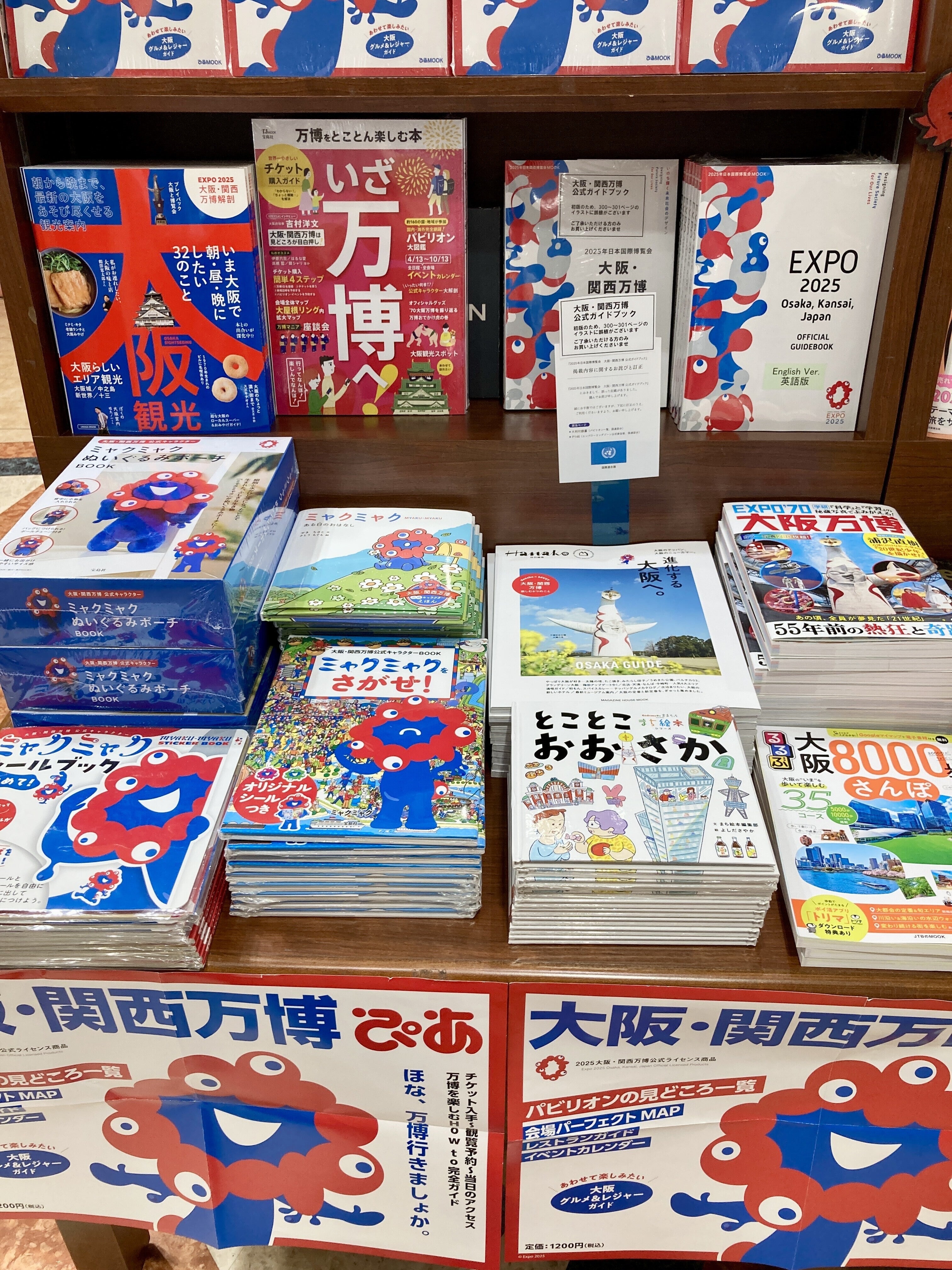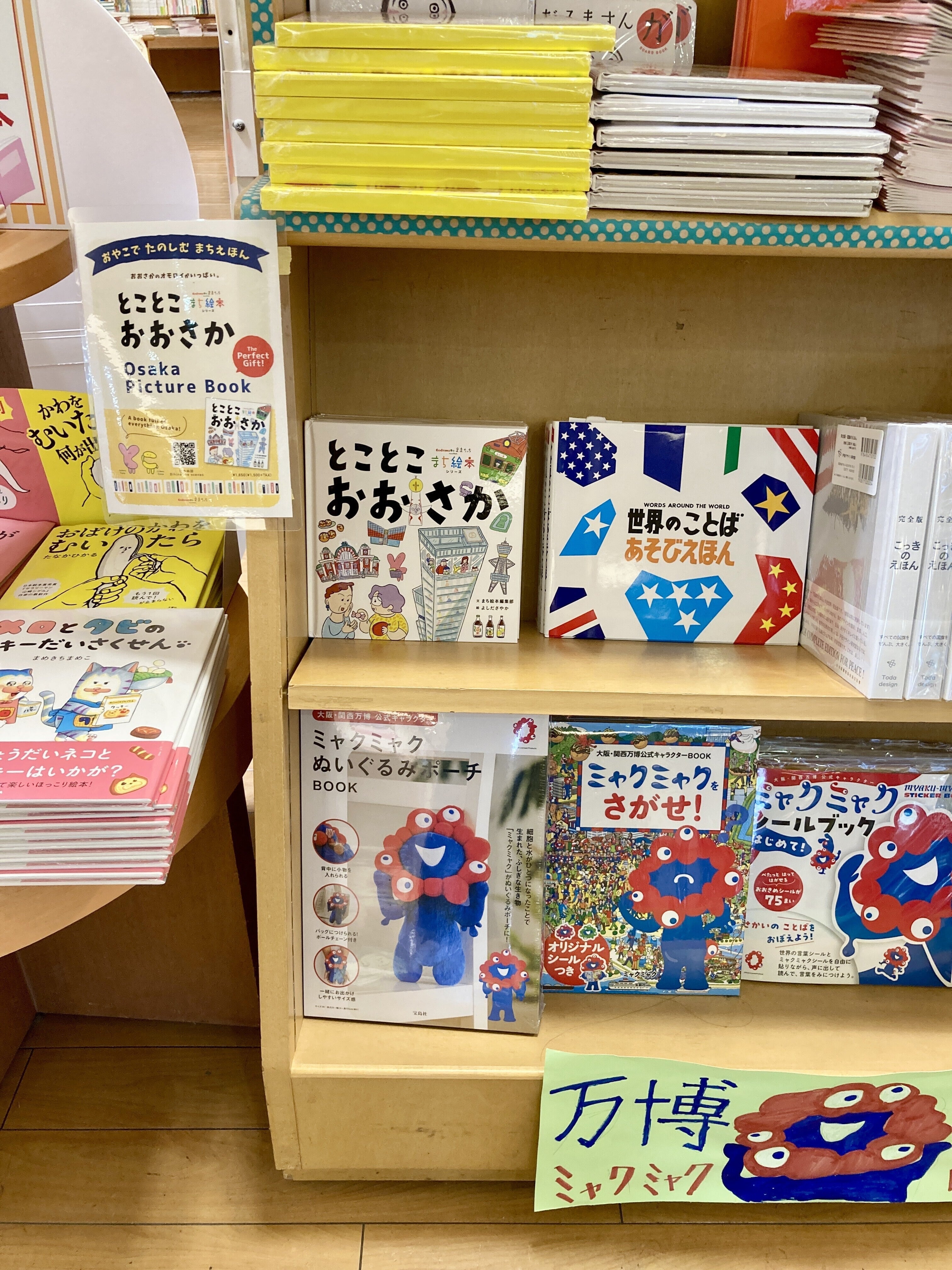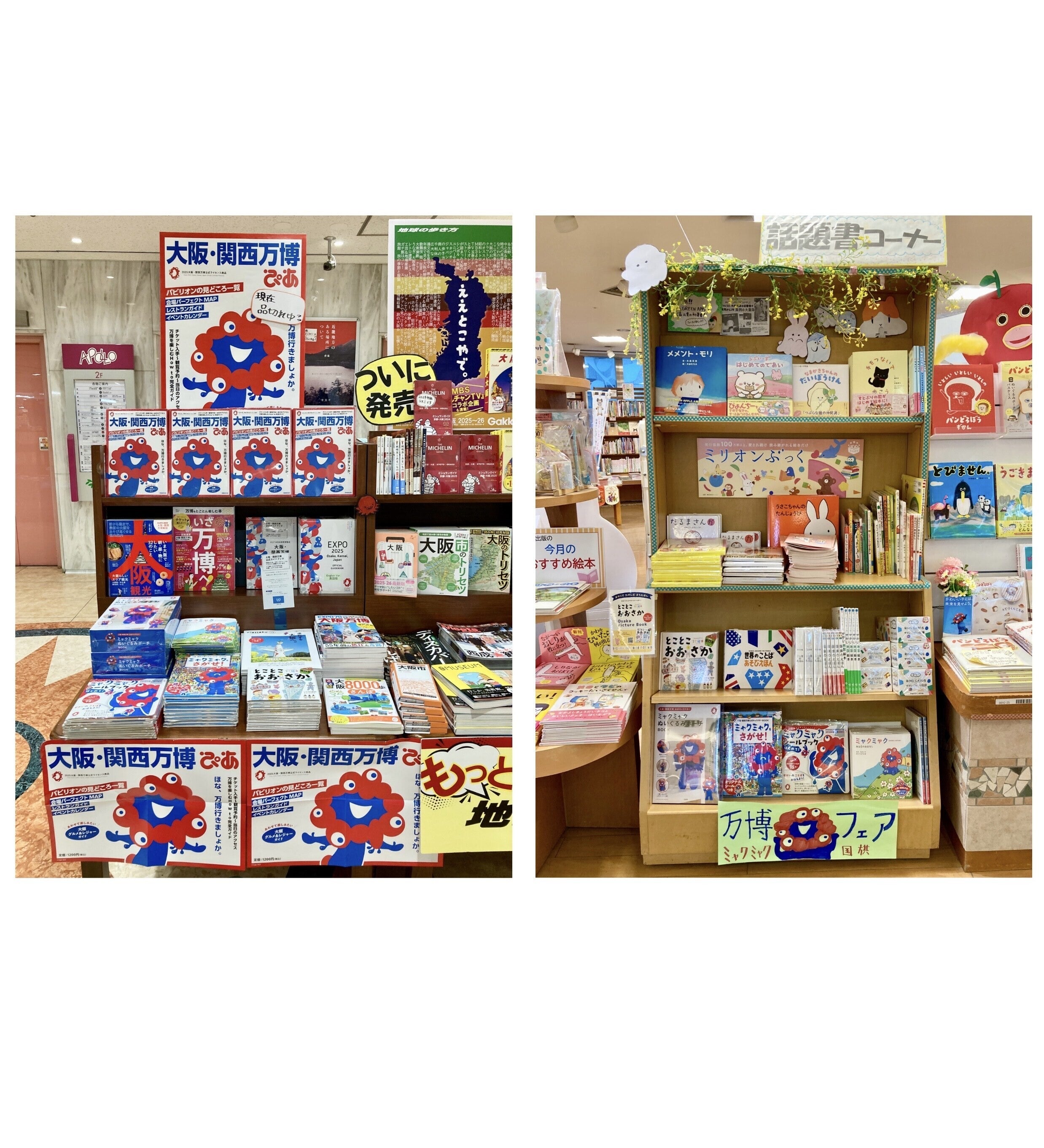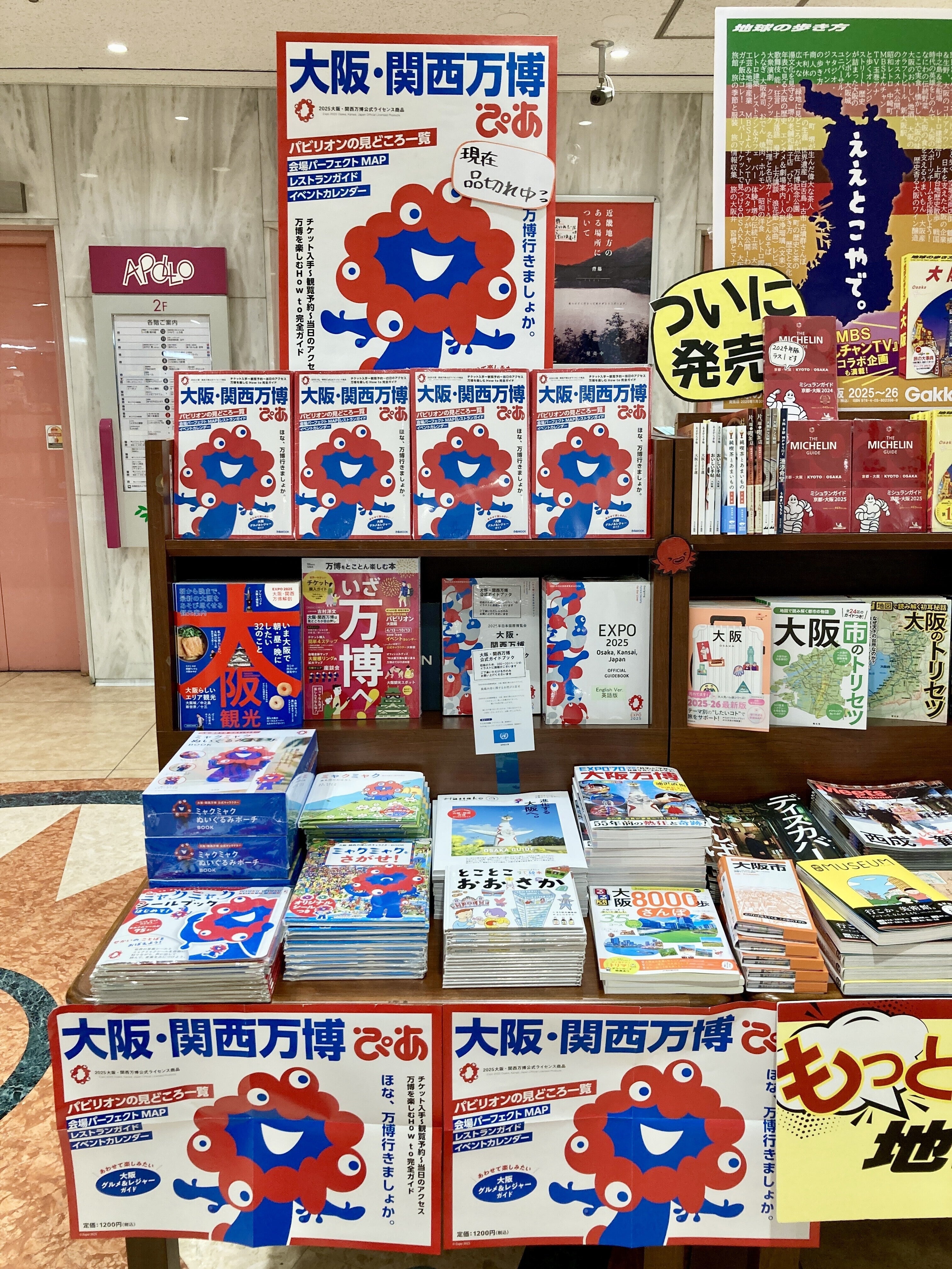 エレベーターとエスカレーターの間、万博・大阪を楽しむ本がずらっと並ぶ万博フェアの棚