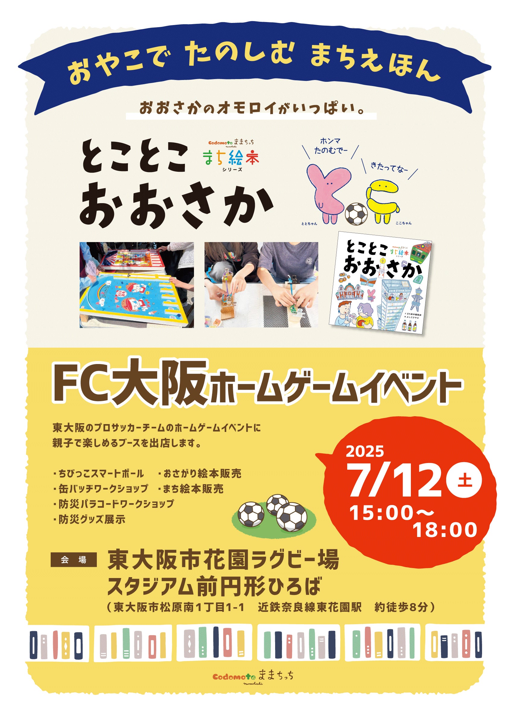 まち絵本にも登場する東大阪のプロサッカーチームFC大阪さんのホームゲームイベントに、親子で楽しめるブースを出店します。ぜひ、遊びに来てくださいね!