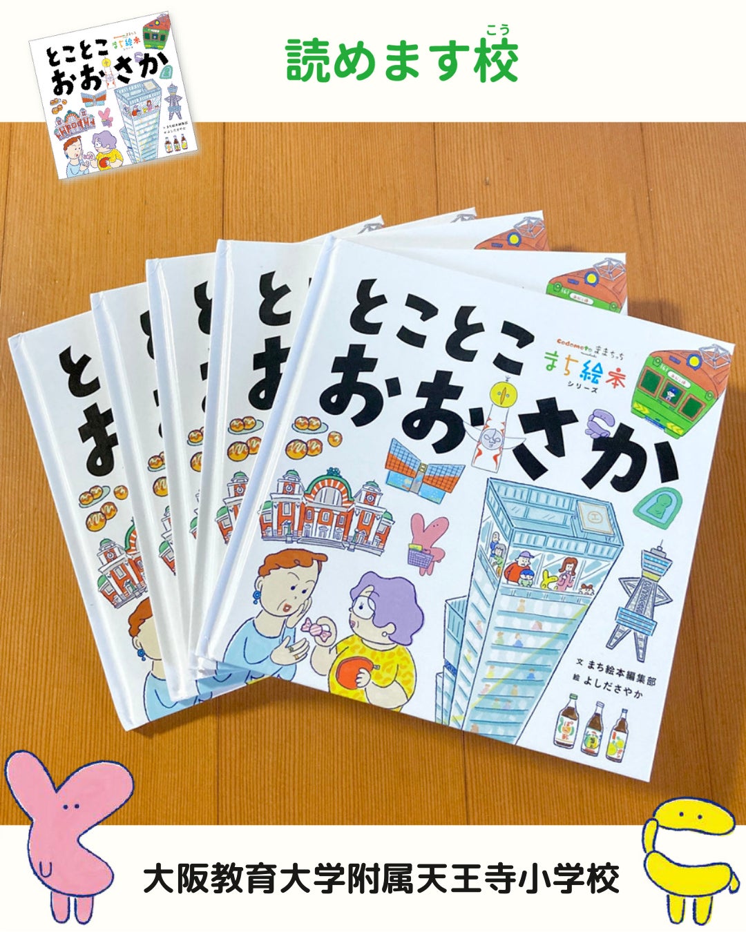 大阪市阿倍野区にある大阪教育大学附属天王寺小学校の低・中学年用の本棚と図書室に、まち絵本を置いていただけるようになりました。