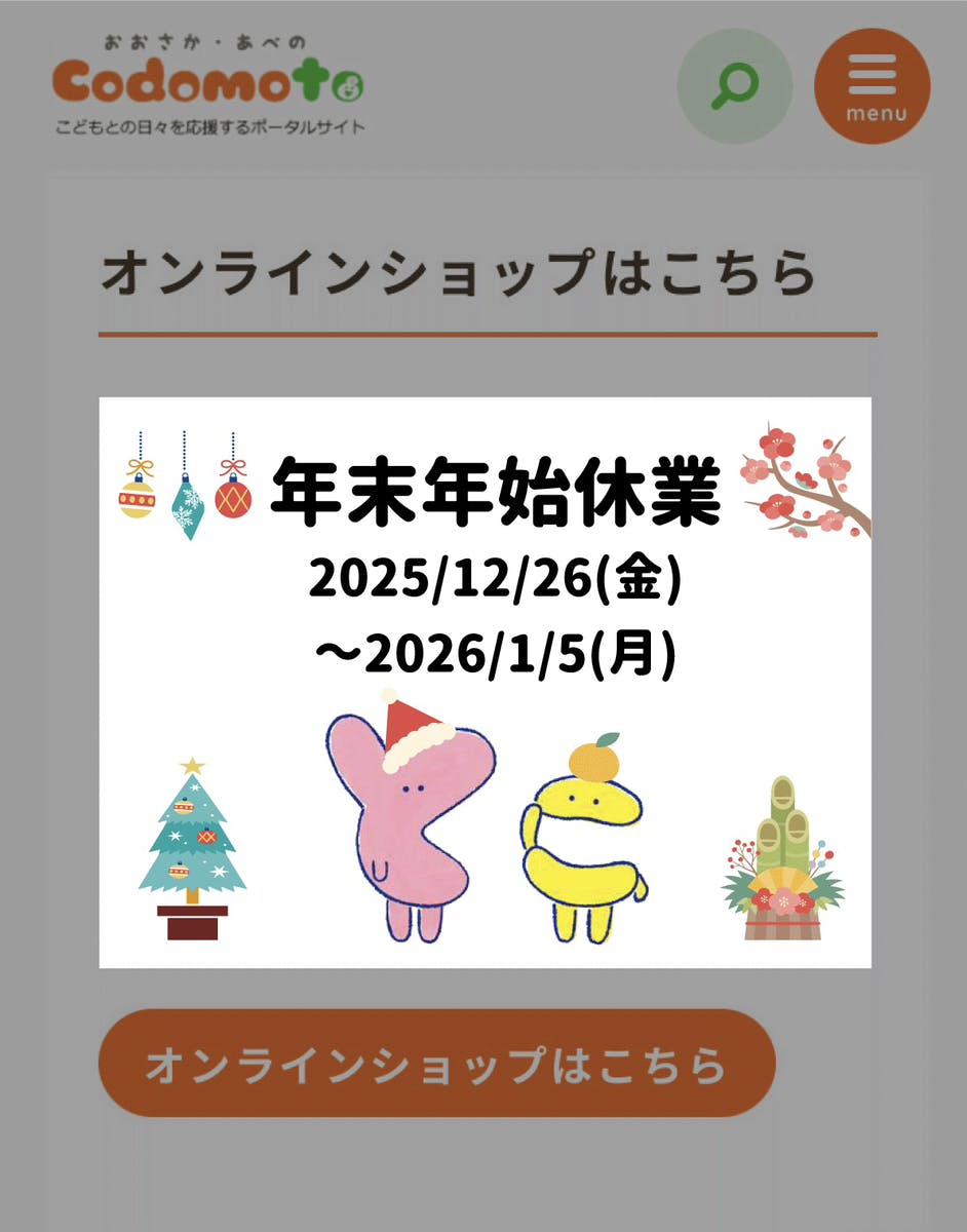 2025/12/22 16:30codomotoままちっちです。この度、大阪市のふるさと納税返礼品として「まち絵本 とことこおおさか」が登録されました!お子さんとの読み聞かせの時間家族でのほっと一息つくとき贈り物にもちょうどいい◎ふるさとへの応援は2種類【絵本+グッズセット】【絵本2冊セット】お申し込みは12/31までページをめくるたびに広がる大阪のまちを、ご家庭でも楽しんでもらえたらうれしいです。ふるさとへの応援お待ちしています! もっと見るオンラインショップ年末年始休業のご案内