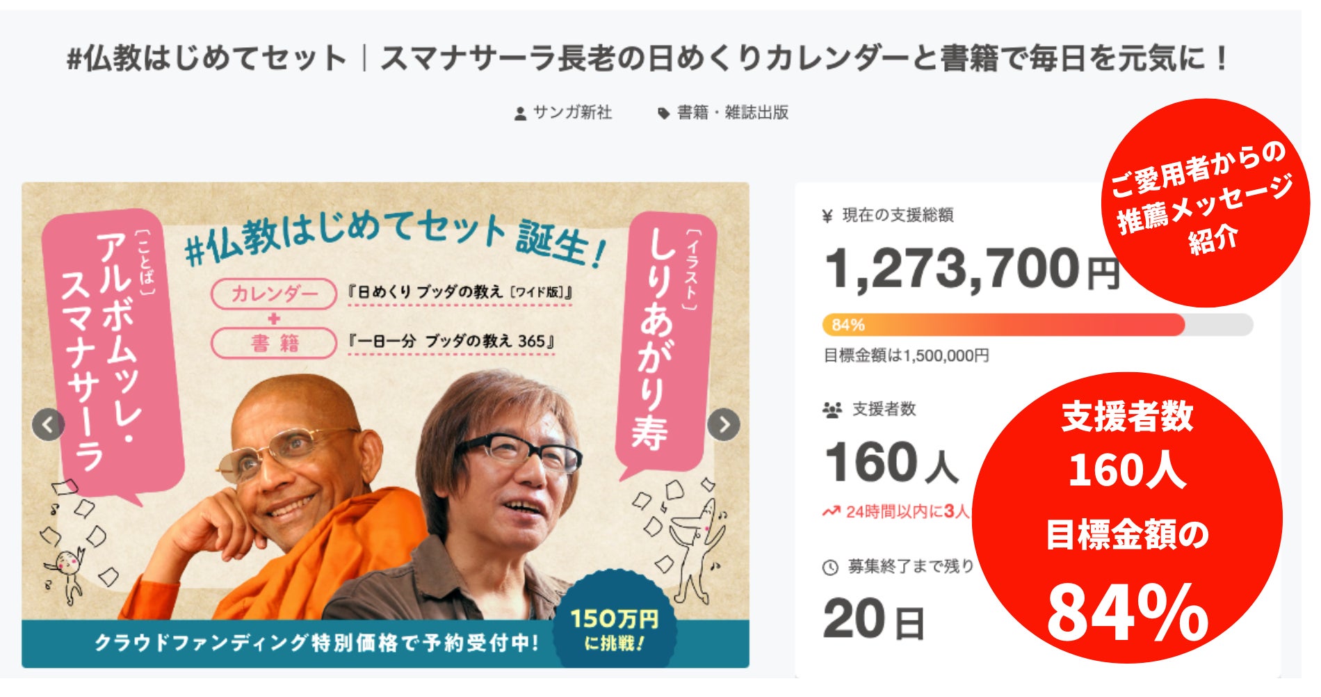「#仏教はじめてセット|スマナサーラ長老の日めくりカレンダーと書籍で毎日を元気に!」クラウドファンディングでは、仏教を日常の生活に楽しく取り入れることができる「日めくりカレンダー」と「書籍」のご予約を、お得な特別価格で受け付けています。