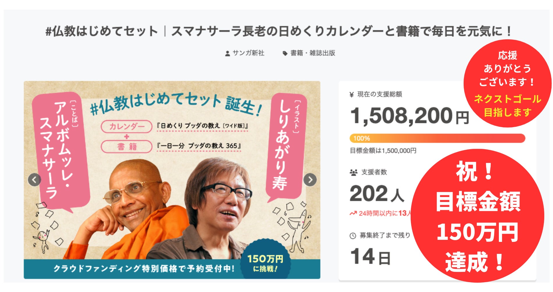 7月20日(土)にスタートしました、「#仏教はじめてセット|スマナサーラ長老の日めくりカレンダーと書籍で毎日を元気に!」クラウドファンディングは、本日8月17日(土)に、目標金額の150万円に到達することができました!