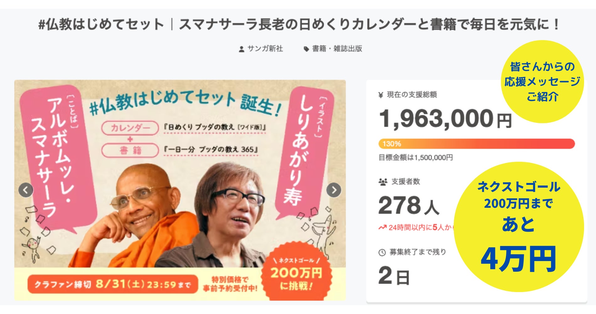 「#仏教はじめてセット|スマナサーラ長老の日めくりカレンダーと書籍で毎日を元気に!」クラウドファンディングは、目標金額150万円を突破し、現在、ネクストゴール200万円を目指して活動しています!