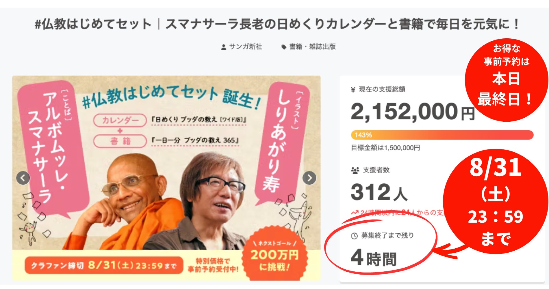 「#仏教はじめてセット|スマナサーラ長老の日めくりカレンダーと書籍で毎日を元気に!」クラウドファンディングも残り4時間となりました。