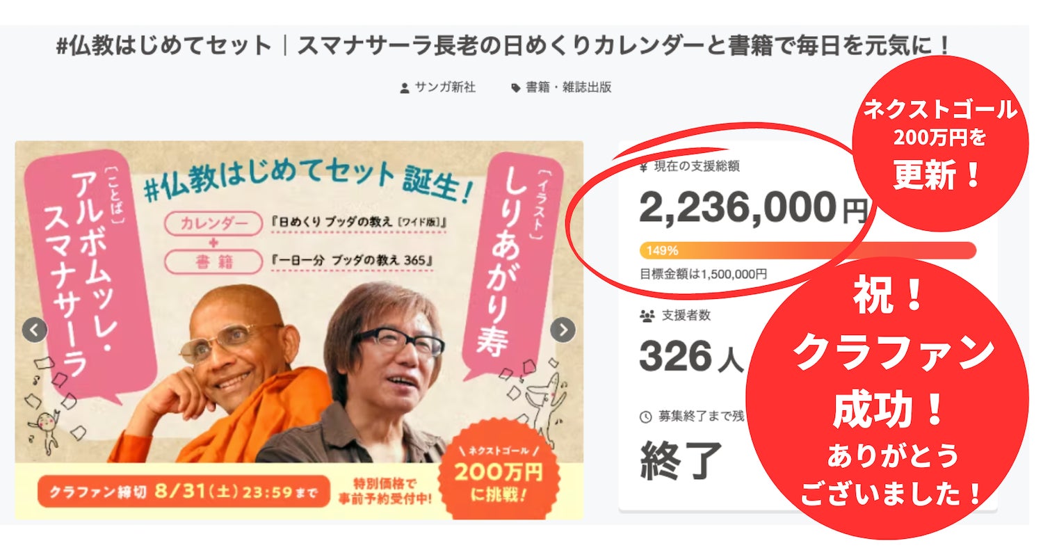 アルボムッレ・スマナサーラ長老としりあがりさんのカレンダー『日めくりブッダの教え[ワイド版]』と、スマナサーラ長老の書籍『一日一分ブッダの教え365』の事前予約クラウドファンディングが、2024年8月31日(土)23時59分に終了しました。