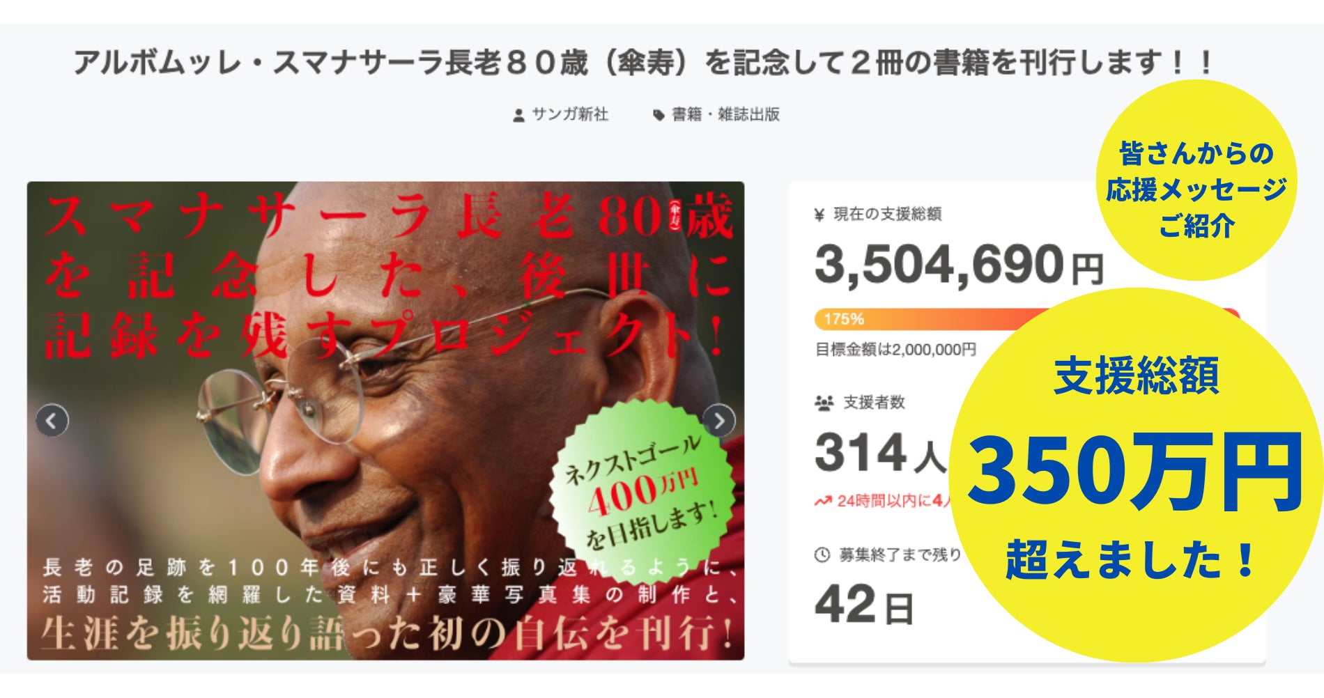 「アルボムッレ・スマナサーラ長老80歳(傘寿)を記念して2冊の書籍を刊行します!!」クラウドファンディングは、スタートから21日目となる本日1月17日(金)に、支援総額が350万円を超えました!